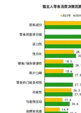 原料成分是猫主人主要关注的因素,占比为60.1%。其次是零食的营养价值,占比为41.1%。与2023年相比,宠主对喂食/储存便捷性、用户口碑、功能性、与宠物互动、品牌知名度的关注度大幅上升,其他消费决策因素占比均有不同程度的下降。