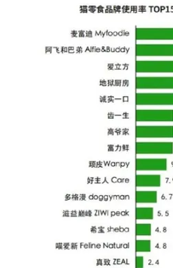 猫零食品牌使用率分布相对分散