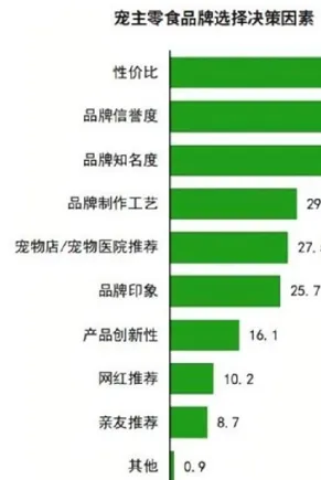 性价比是宠主在选择零食品牌时最为关注的因素宠主对性价比的关注度较高,占比为57.2%。其次是关注品牌信誉度、品牌知名,占比分别为44.8%、37.2%。此外,宠主对品牌制作工艺较为关注,占比为29.5%。