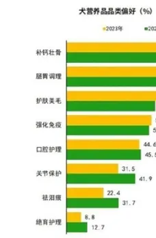 补钙壮骨和肠胃调理仍是犬主人最偏好的犬营养品品类补钙壮骨、肠胃调理仍是犬主人最为关注的品类,占比分别为67.7%、61.1%。与2023年相比,犬主人对口腔护理、关节保护、祛泪痕,绝育护理方面的关注度有所上升,对补钙壮骨、肠胃调理、护肤美毛、强化免疫方面的关注度有所下降。