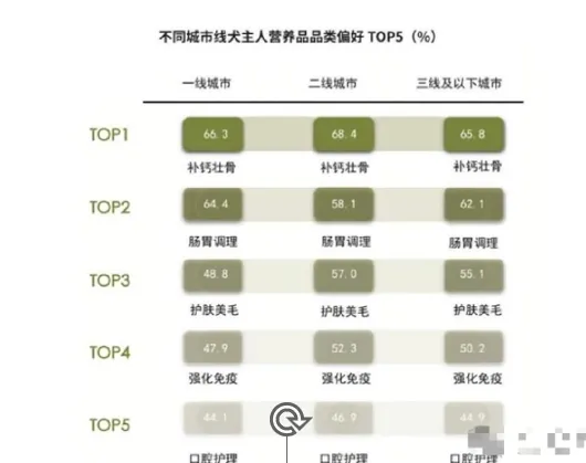 二线城市犬主人对护肤美毛、强化免疫、口腔护理类营养品的偏好度相对较高,占比分别为57.0%、52.3%、46.9%.