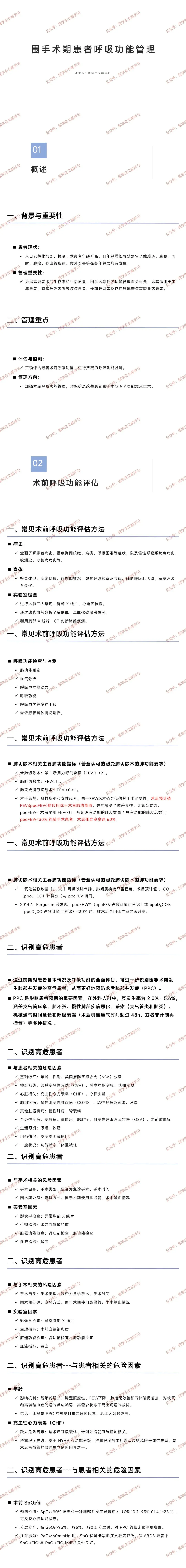 围手术期呼吸功能管理是保障患者术后生存率和生活质量的关键,核心围绕 “术前评估识别高危、术中优化干预、术后预防并发症” 展开,重点针对老年、有基础肺部疾病等高危人群,通过多维度管理降低肺部并发症(PPC)风险。