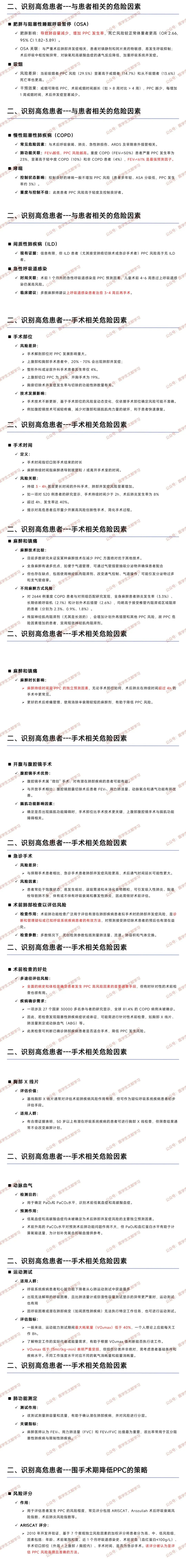 - 手术部位:上腹部、胸部手术风险最高(PPC 发生率 20%~70%),腹腔镜手术风险低于开腹手术。