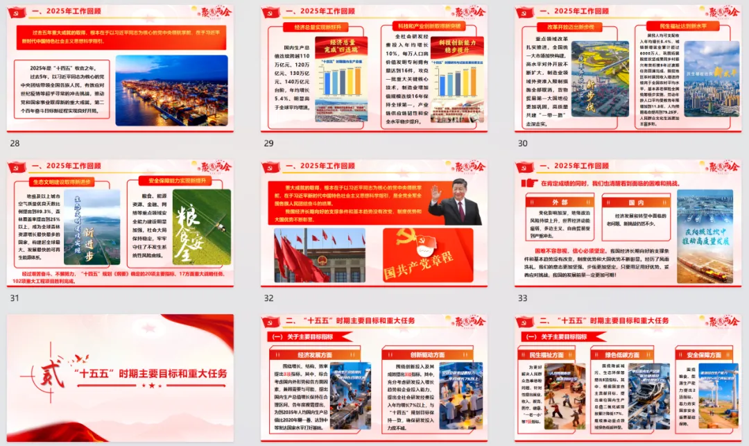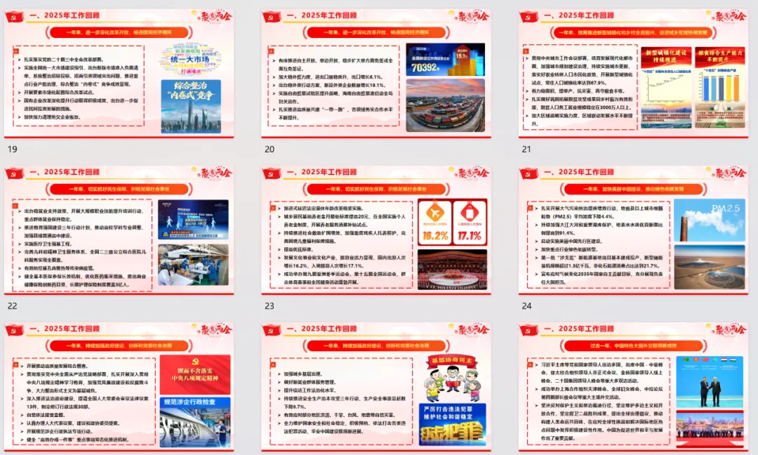 PPT共115页,配套演讲稿19800字,完整包含四个部分。设计大方,重点突出,讲解形象生动,帮助学员快速掌握报告精髓。适合各单位党组织、机关、企业、高校开展专题学习。