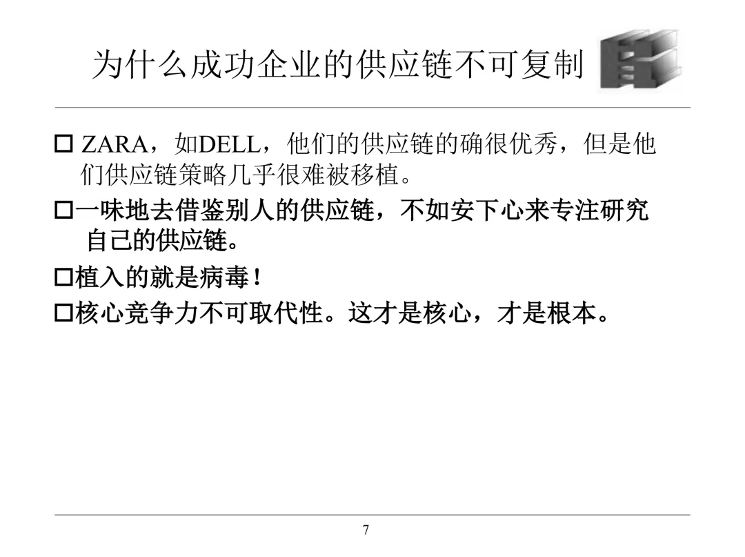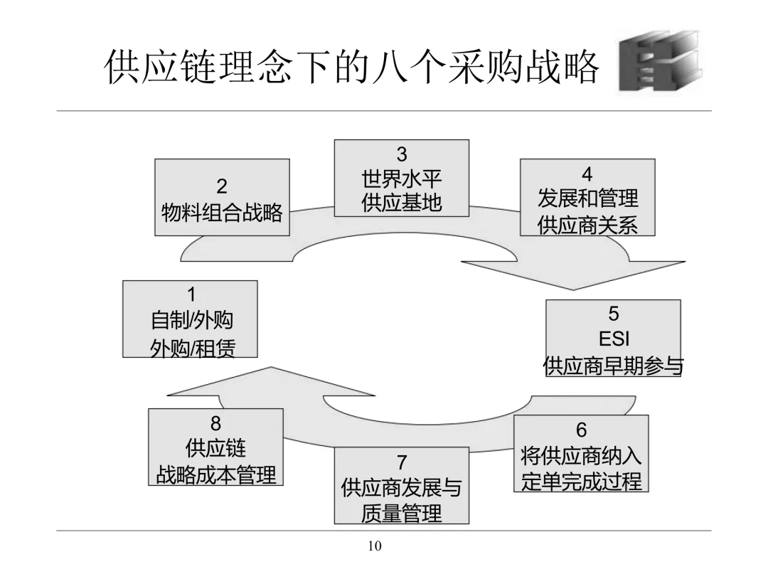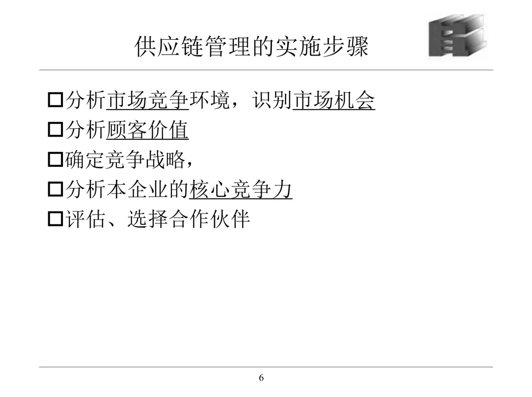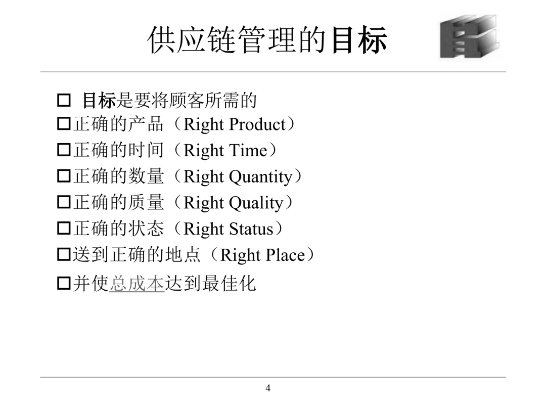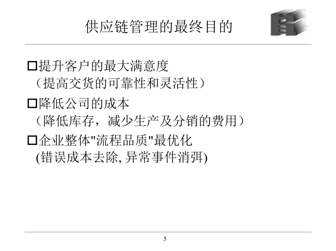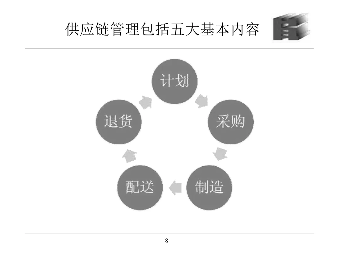 一种集成的管理思想和方法,它执行从供应商到最终用户的物流的计划和控制等职能。o指企业通过改善上、下游供应链关系,整合和优化供应链中的信息流、物流、资金流,以获得企业的竞争优势整合并优化了供应商、制造商、零售商的业务效率,使商品以正确的数量、正确的品质、在正确的地点、以正确的时间、最佳的成本进行生产和销售。