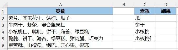 在下图 1 的 A 列中查找 C 列的关键字,并在 D 列中返回结果。