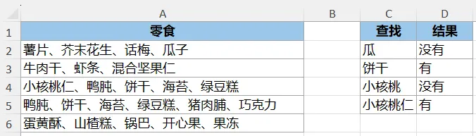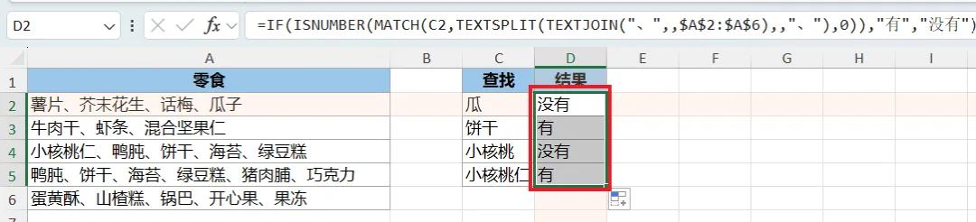 IF(ISNUMBER(...,"有","没有"):判断上述结果是否为数值,是的话就是在区域中有这个零食,不是就说明没有。