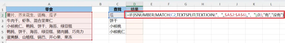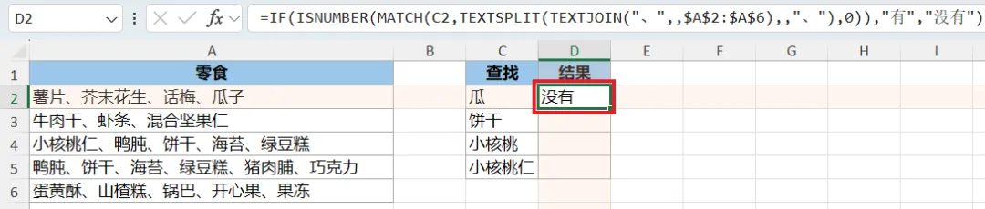 =IF(ISNUMBER(MATCH(C2,TEXTSPLIT(TEXTJOIN("、",,$A$2:$A$6),,"、"),0)),"有","没有")