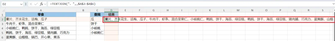 TEXTJOIN("、",,$A$2:$A$6):将 $A$2:$A$6 区域中的字段合并起来,中间用“、”分隔开;