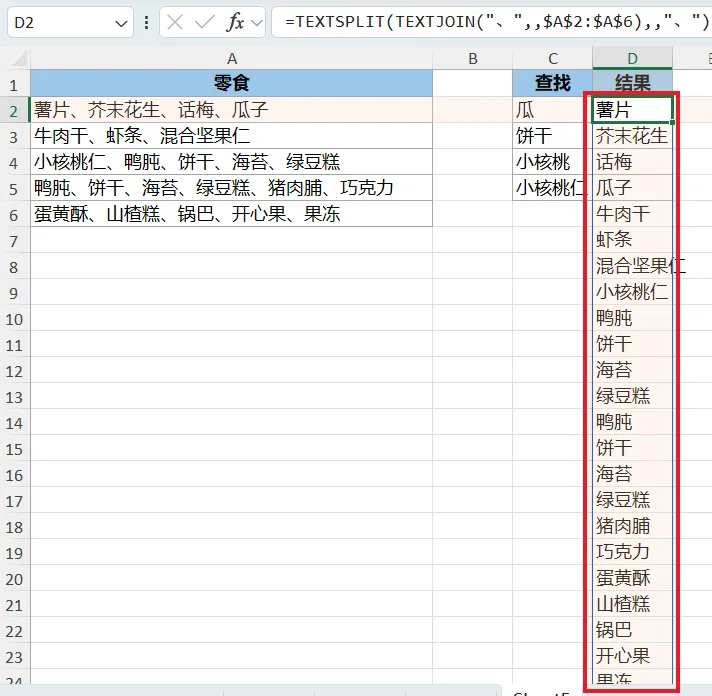 TEXTSPLIT(...,,"、"):将合并后的上述数组以“、”为分隔符,拆分为行;