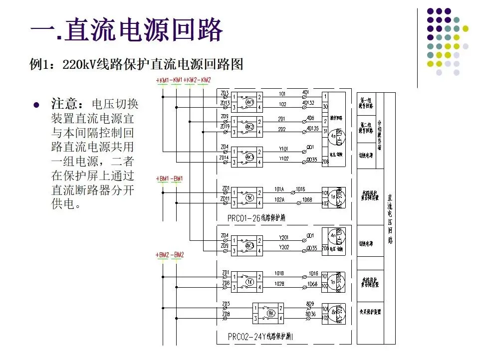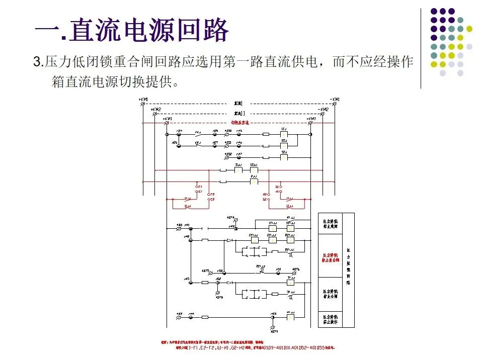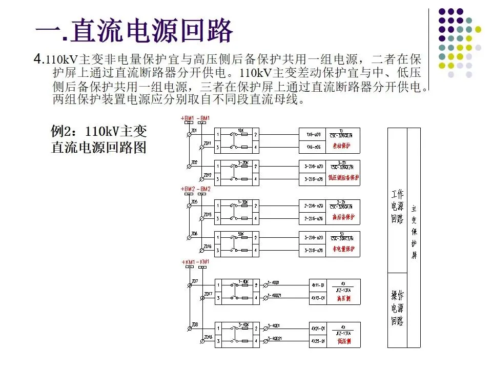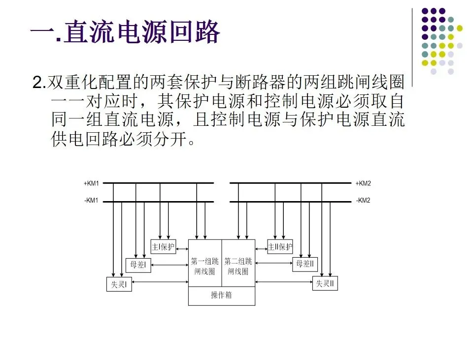 1.互为冗余配置的两套主保护、两套安稳装 置、两组跳闸回路、两套通道设备等的直流供电电源必须取自不同段直流母线,两组直流之间不允许直流回路采用自动切换(不包括通讯专业提供的带ATS自动切换的直流电源)。