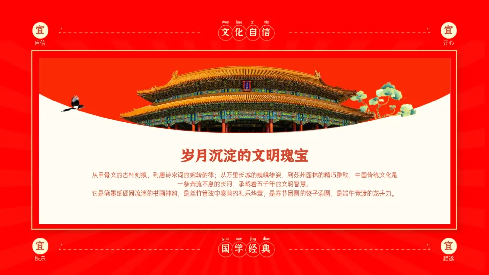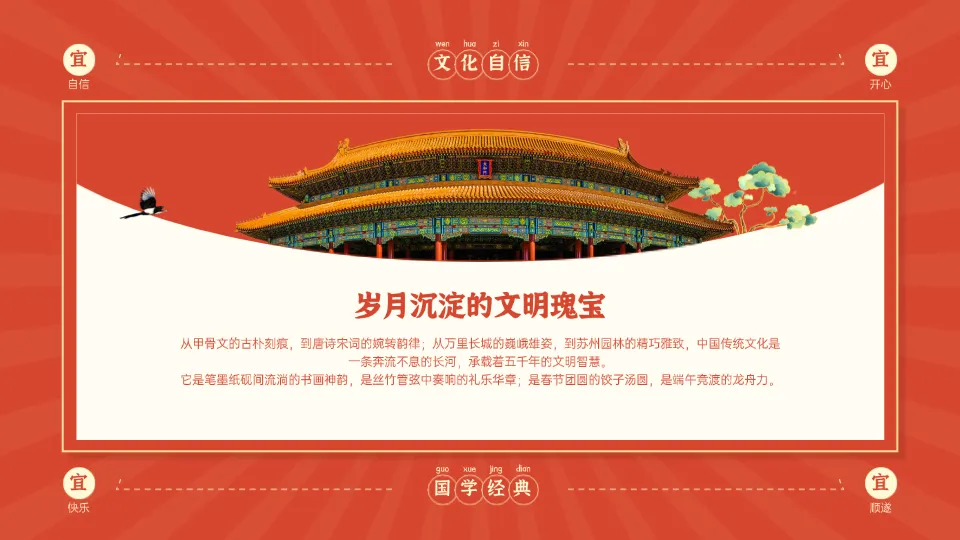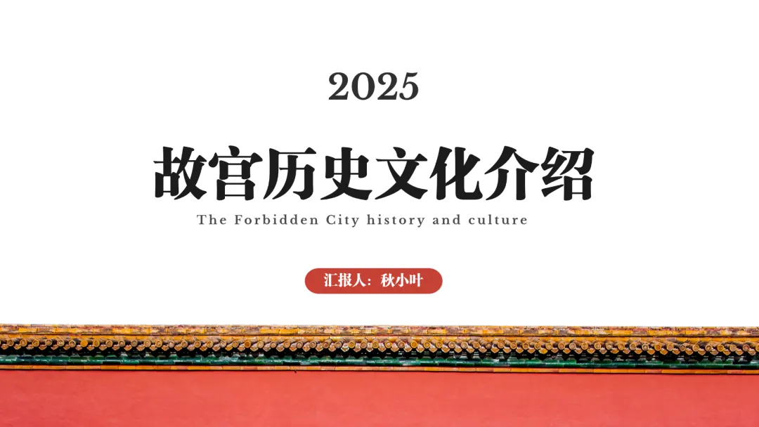 下面这张介绍故宫历史的 PPT 排版毕竟简单,底部只有一块红色的色块,看上去有些死板。