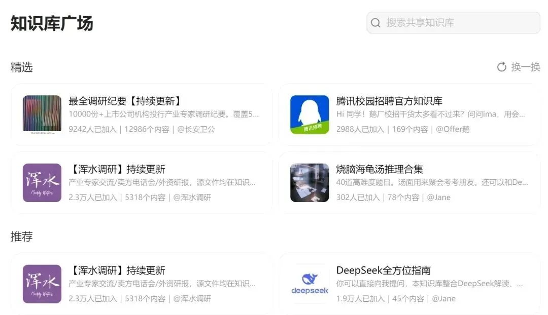 在知识库广场中可以找到已分享的知识库,加入后即可以获取丰富的资源。