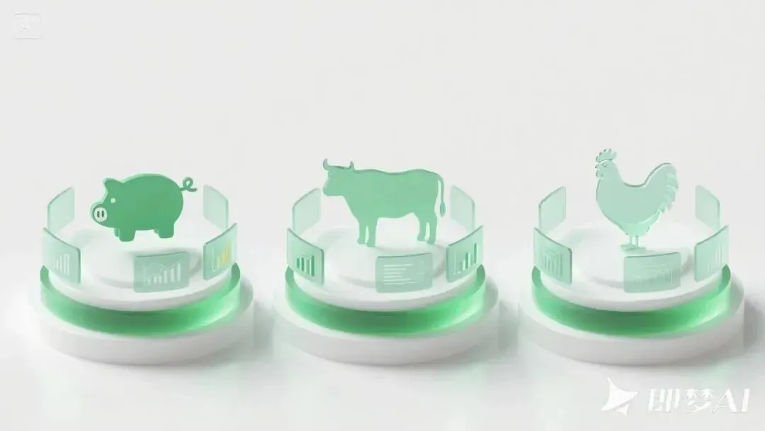 (提示词参考:纯白背景,正面低视角平铺,左中右三个等大等距且细节丰富的圆台上有多个玻璃屏幕和一些数据图表,左边有一只猪图标,中间有一头牛图标,右边有一只鸡图标。整体高级透明磨砂玻璃质感建模,绿色+无色为主,带有科技类数据、线条元素。)
