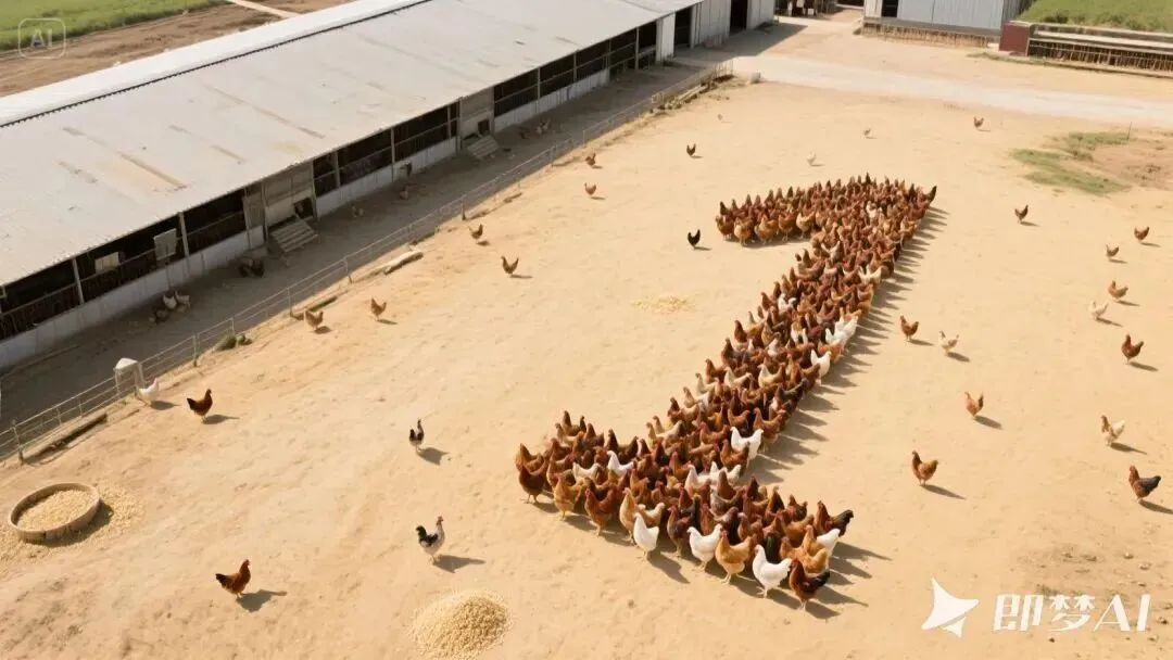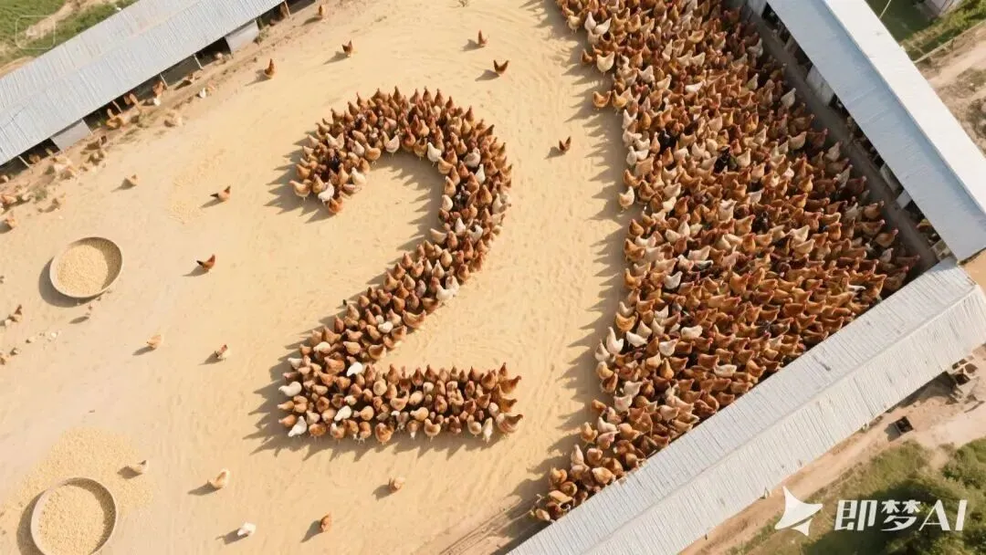(提示词参考:天空中俯瞰大型养鸡场,画面右侧是大量活鸡排列成的数字 “1”,数字周围是淡黄色泥土地,零星的鸡饲料,俯视,斜角透视视角,数字呈现右上左下的对角线构图。写实,高清摄影,8k)