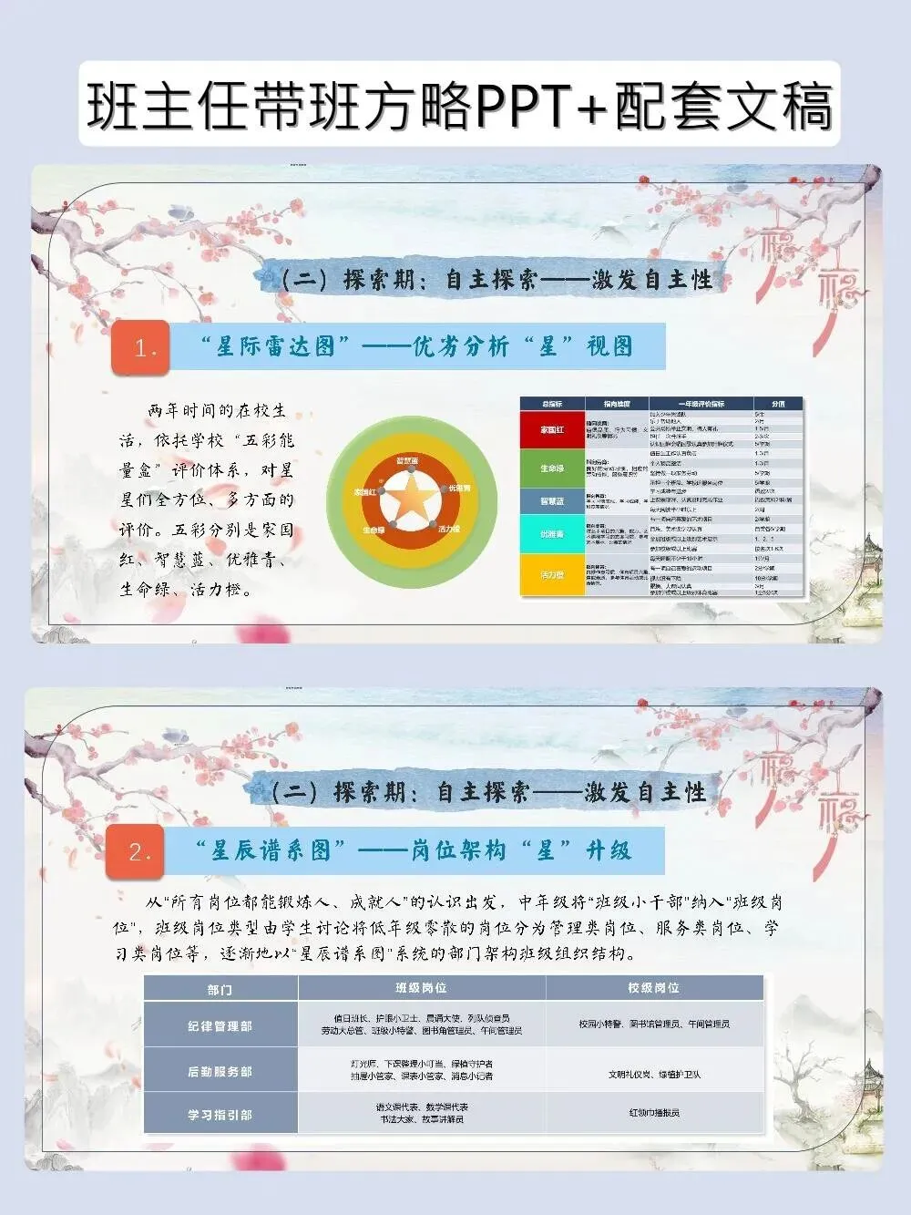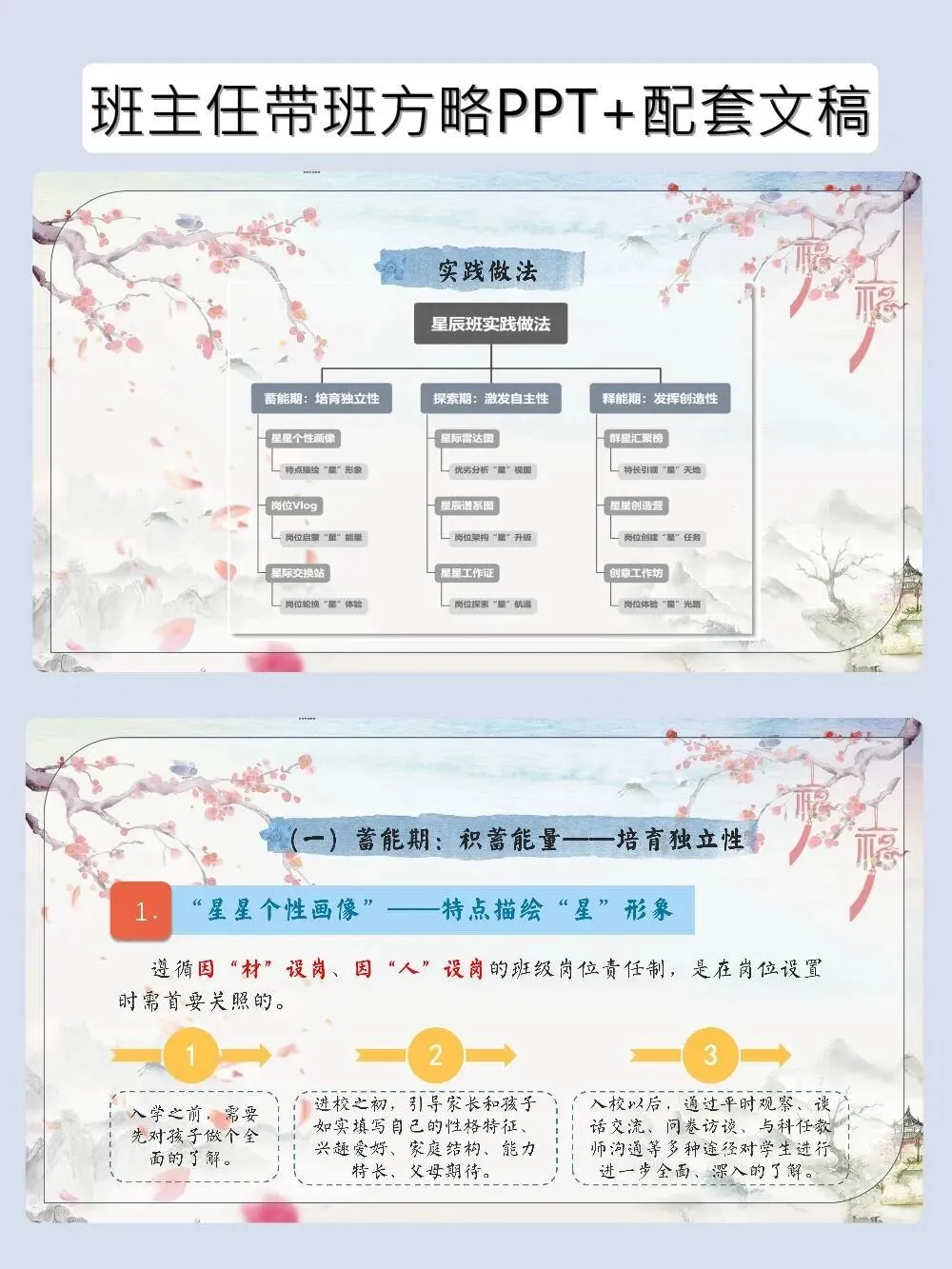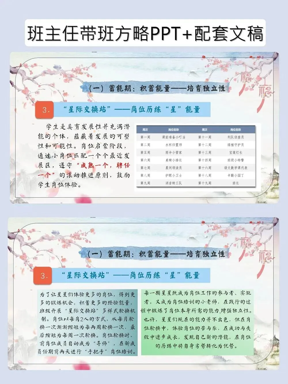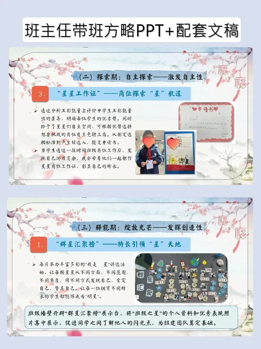 神仙带班育人方略PPT帮学生找到自己的C位 班主任带班育人方略–岗位赋能|让每一颗星星找准自己的“C”位 当班主任遇到这套带班育人方略,简直如获至宝!以“星辰”为喻,从蓄能、探索到释能,一步步帮学生培养独立性、自主性和创造性。PPT颜值在线,发言稿干货满满,直接套用,轻松带出让每个学生都发光的班级~