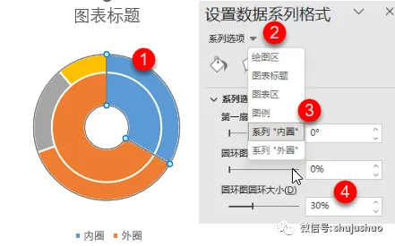 将系列“内圈”的圆环图圆环大小设置为30%,外圈的设置为75%。