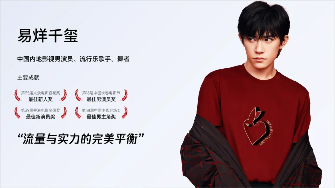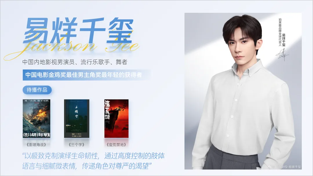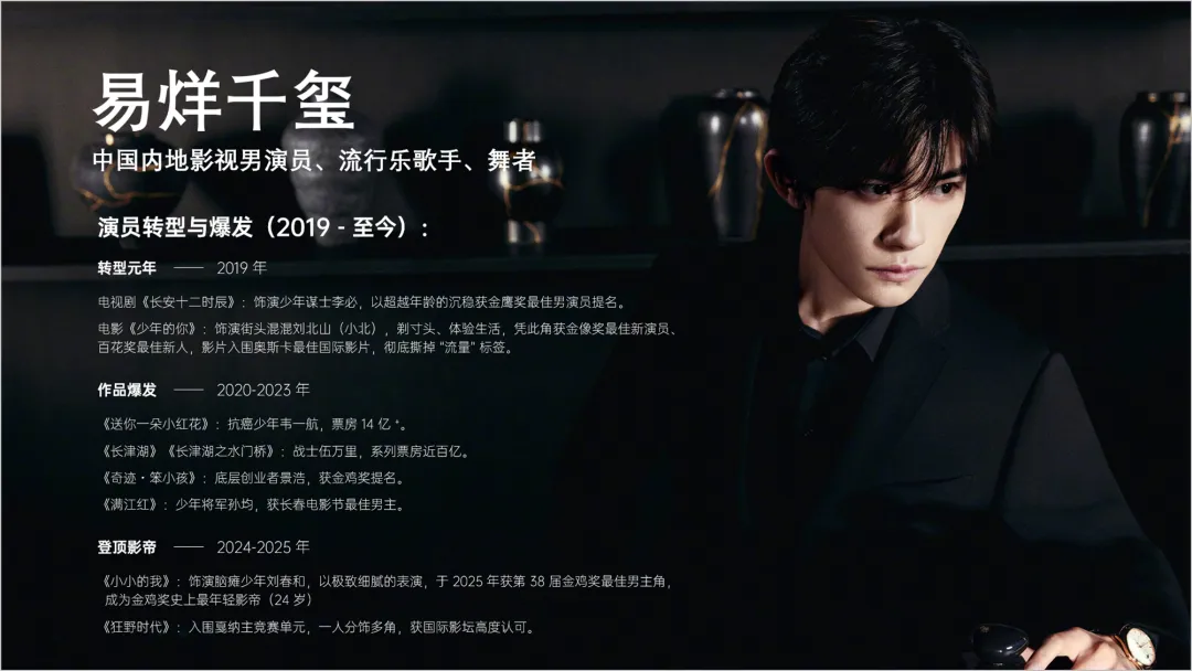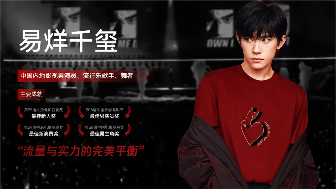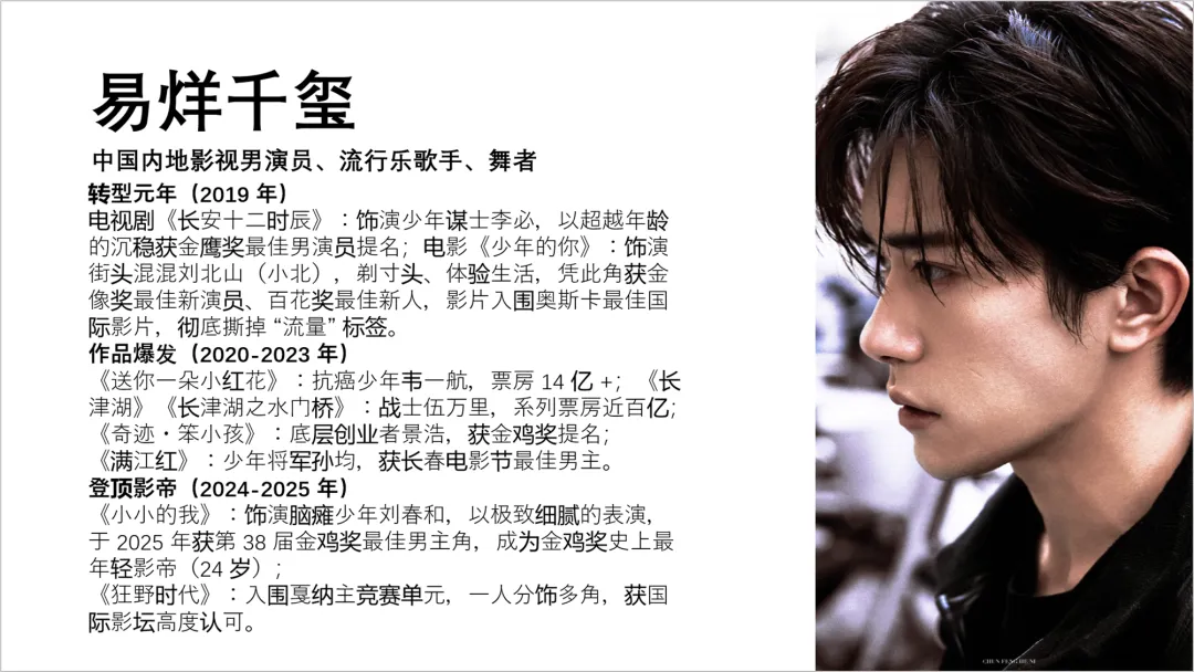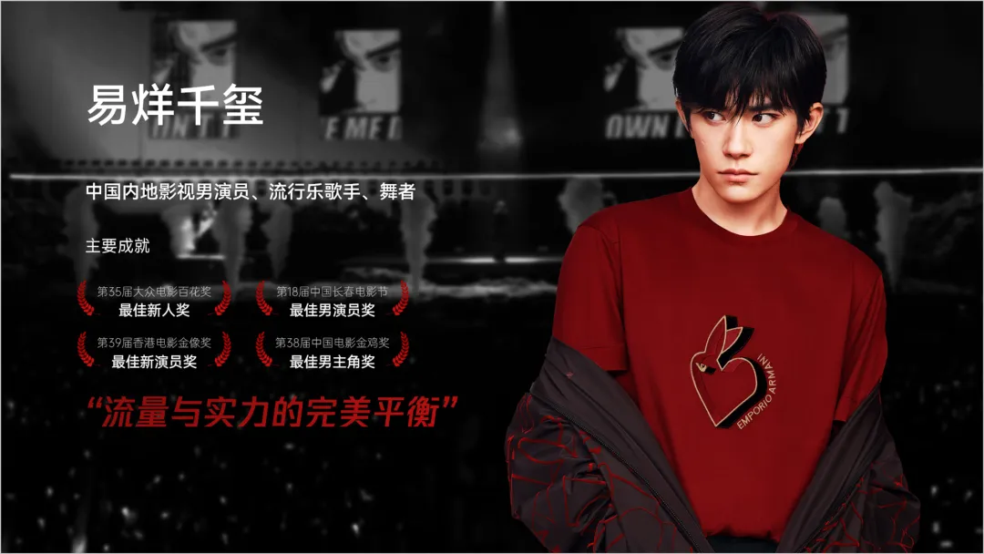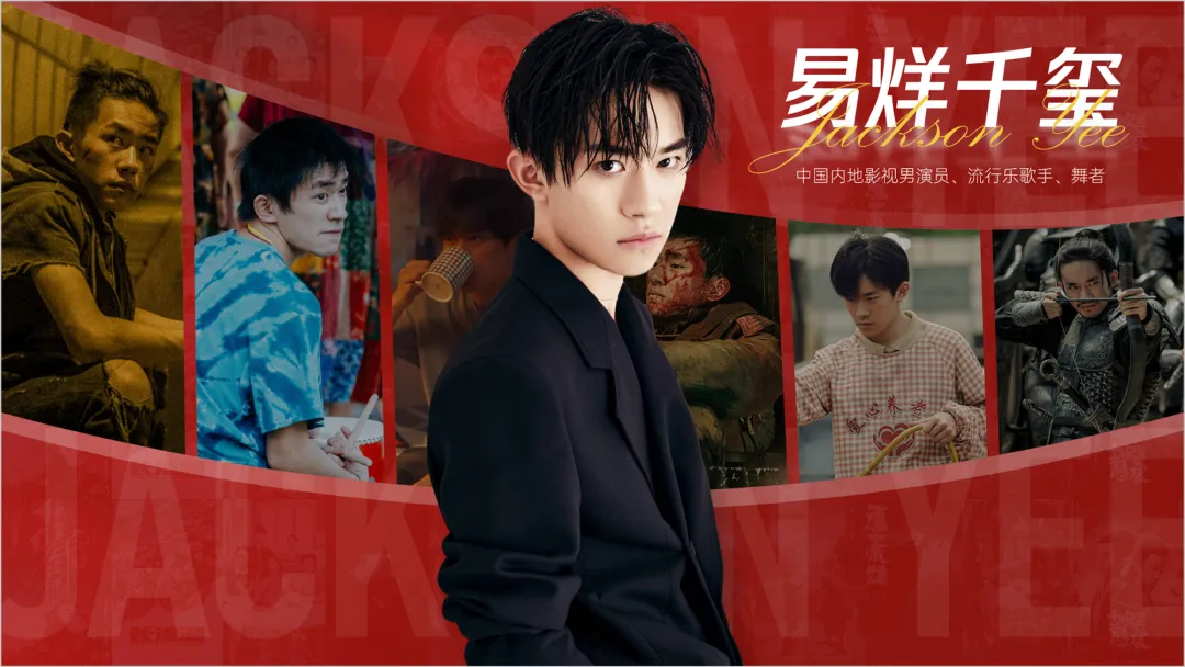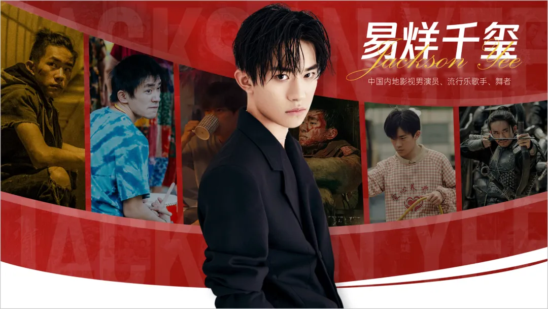 然后选中文本,设置【形状格式】,点击【文本效果】里的【转换】,设置效果即可。选择【曲线:下】的效果,调整文本框大小,摆放至合适的位置。再将文本框改为单独的形状。白色背景有点普通,我们改成红色背景,并加上图片和英文做修饰。由于原稿提供的角色图片尺寸和人物的画面占比不统一。为了让画面更规整,我们重新找几张角色图片,摆到合适的位置,再与形状相交。最后可以在上面叠加一张人物图,右上留白处加上名字介绍,就做好了。如果觉得画面下方太空,我们还可以用形状填补上,增加层次。本文完。