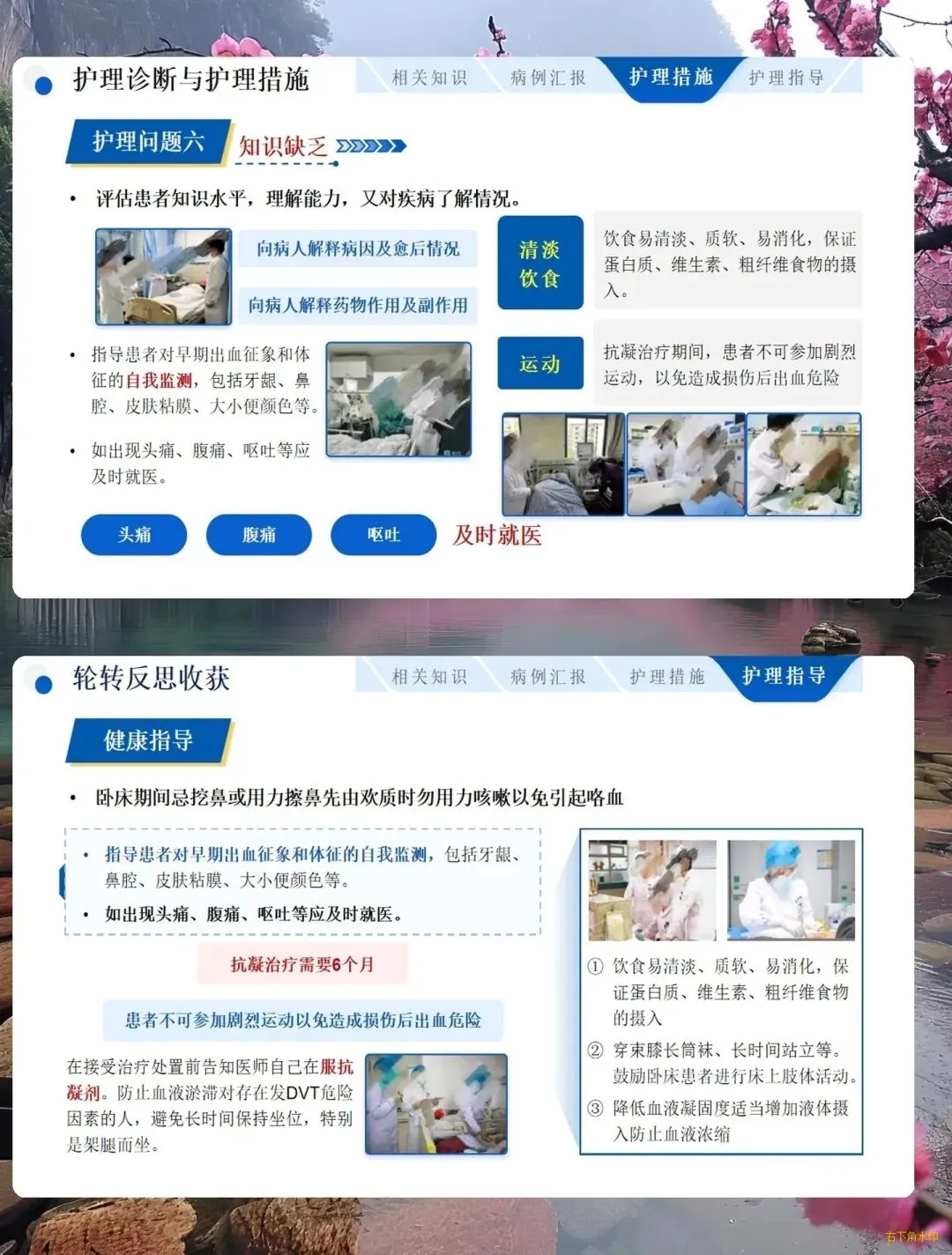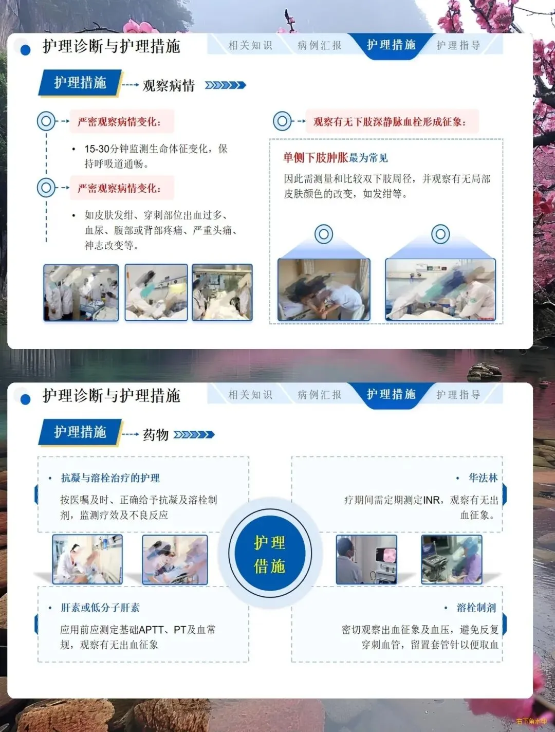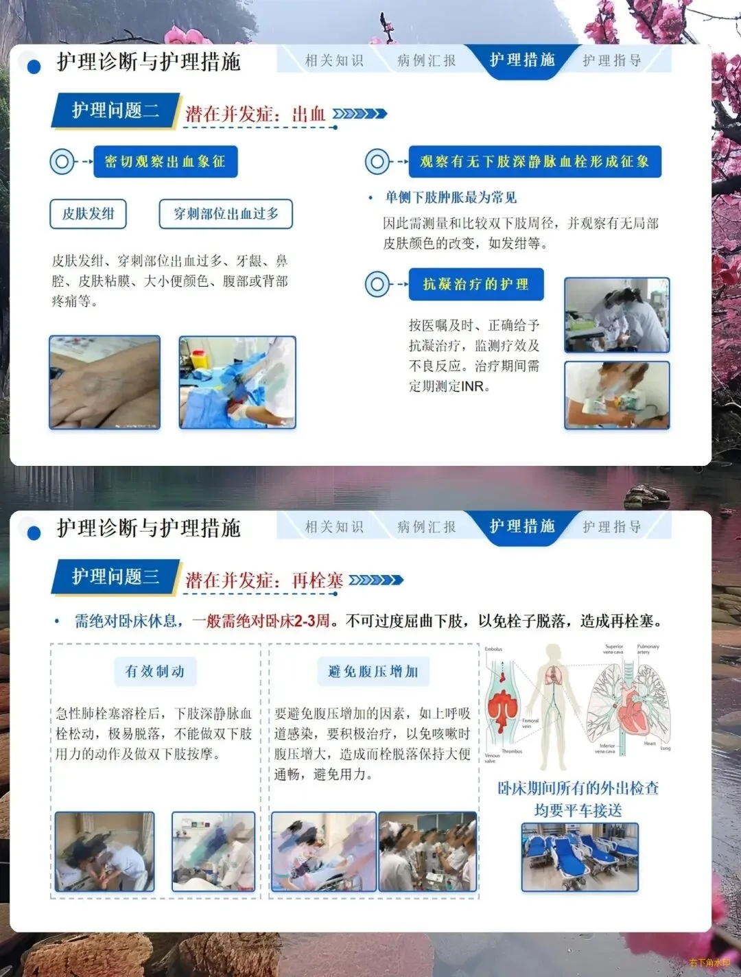 - 用药护理:规范使用抗凝、溶栓药物,用药前监测凝血功能,华法林治疗期间定期监测 INR,警惕出血风险。