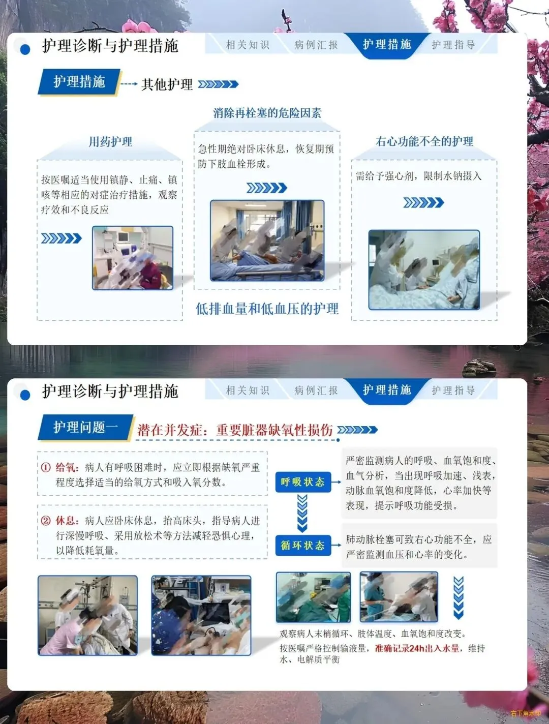 - 并发症防控:严格制动,避免下肢过度活动,保持大便通畅,降低再栓塞风险;限制水钠摄入,记录出入量,预防右心功能不全。