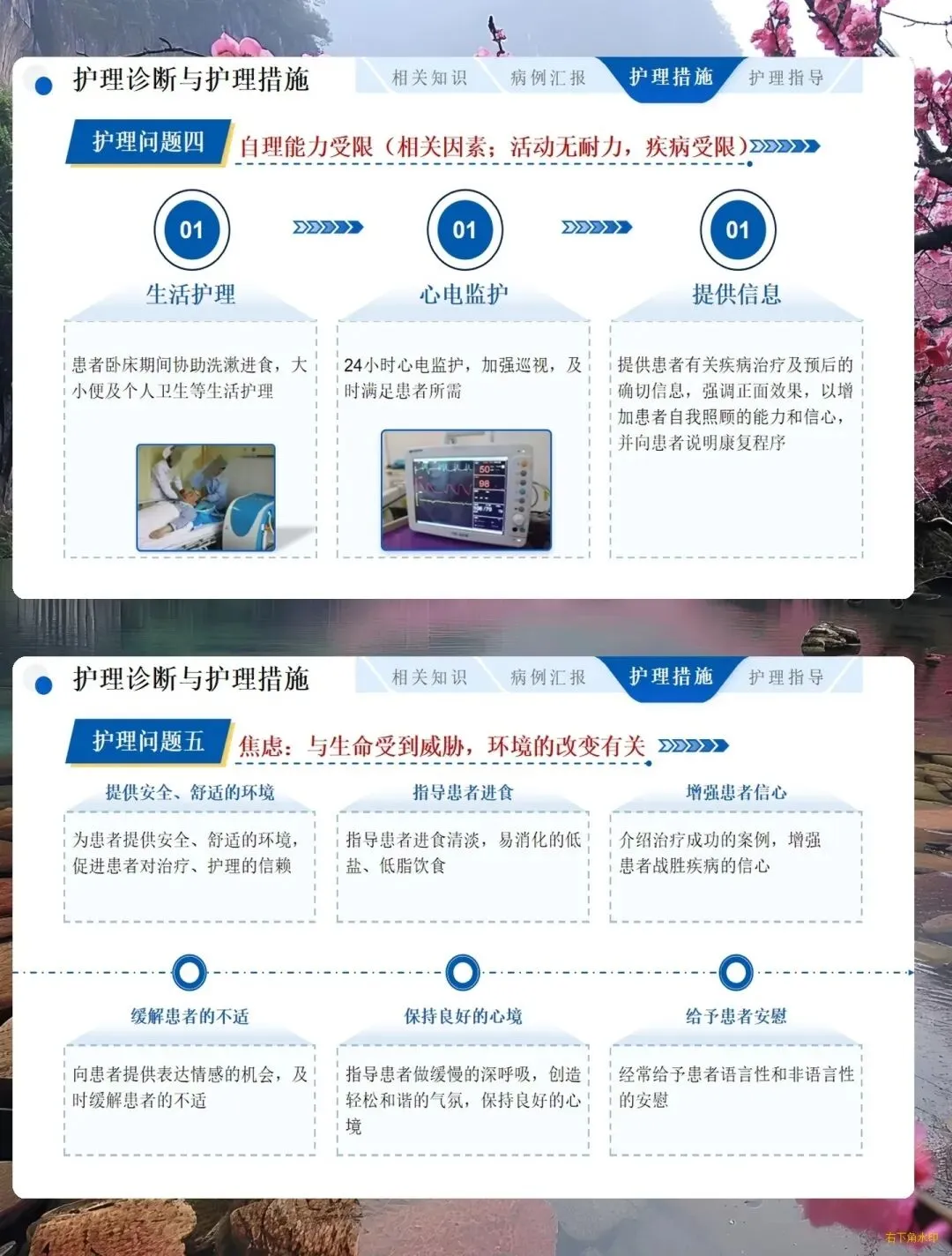 - 基础护理:绝对卧床 2~3 周,抬高床头,持续吸氧 3~4L / 分,给予清淡易消化饮食,加强心理疏导。