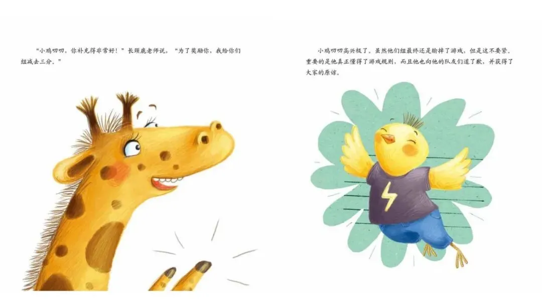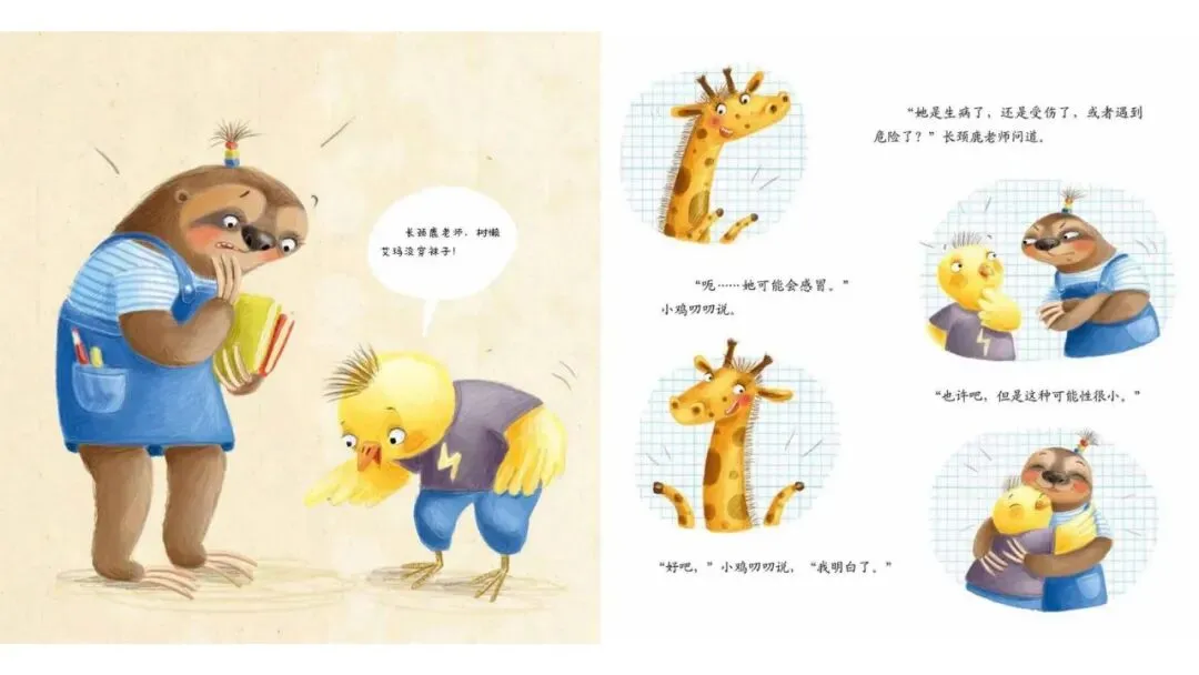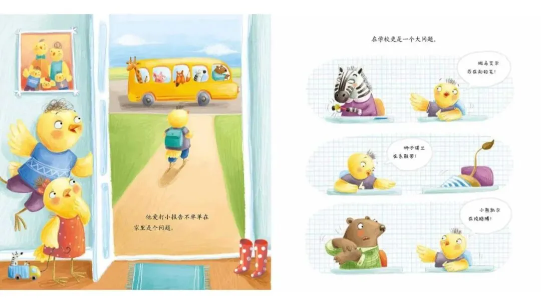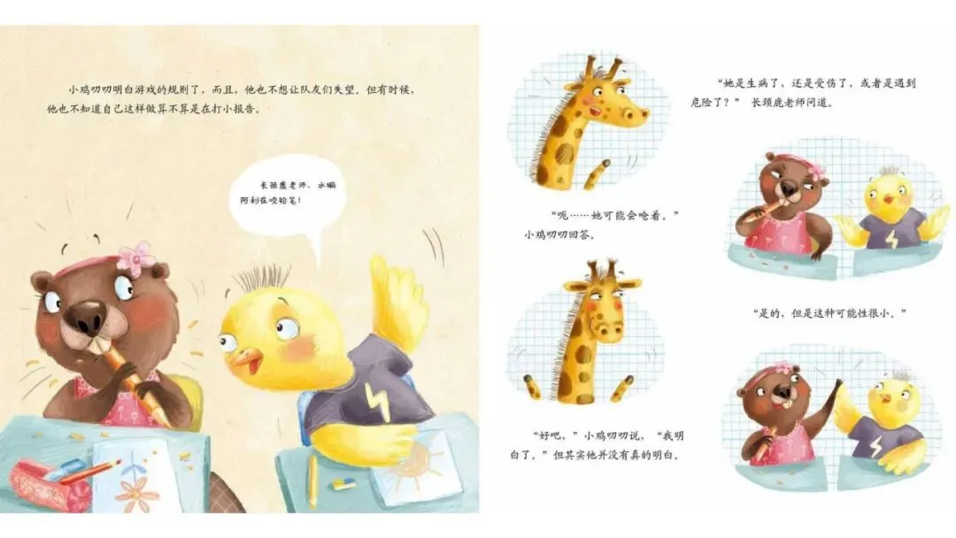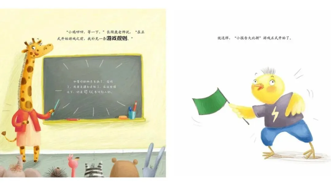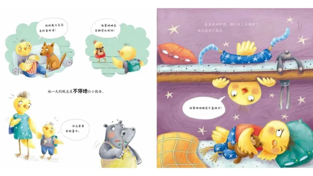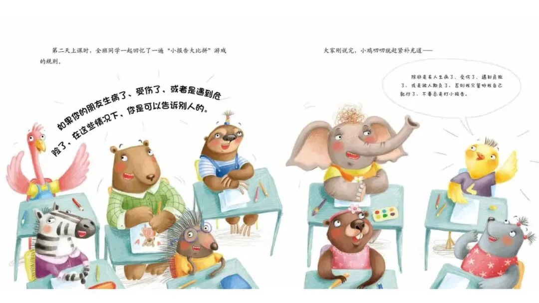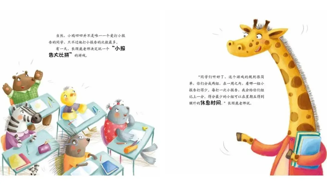 绘本主角小鸡叨叨聪明可爱,却总爱打无关紧要的小报告 —— 不管是狗狗盯着它看、河马哥哥抠鼻子,还是同学削铅笔、系鞋带,它都要立刻告诉妈妈和长颈鹿老师,让大家颇为苦恼。为了帮它改正,长颈鹿老师设计了 “小报告大比拼” 游戏,教会孩子们分清 “必要求助” 与 “多余报告”,最终小鸡叨叨在孤独中学会反思,懂得只有遇到危险、受伤等紧急情况时才需要及时告知他人。适读年龄:4-7 岁(契合该阶段孩子社交能力发展需求,便于理解规则与分寸)。其一,故事还原孩子日常社交场景,打小报告的情节极易引发共鸣;其二,以游戏化方式传递沟通礼仪与边界感,避免说教,孩子更易接受;其三,色彩明快的插画搭配幽默情节,既满足低龄儿童阅读兴趣,又能帮助家长引导孩子学会尊重他人、恰当表达,是助力孩子社交成长的优质亲子共读绘本。