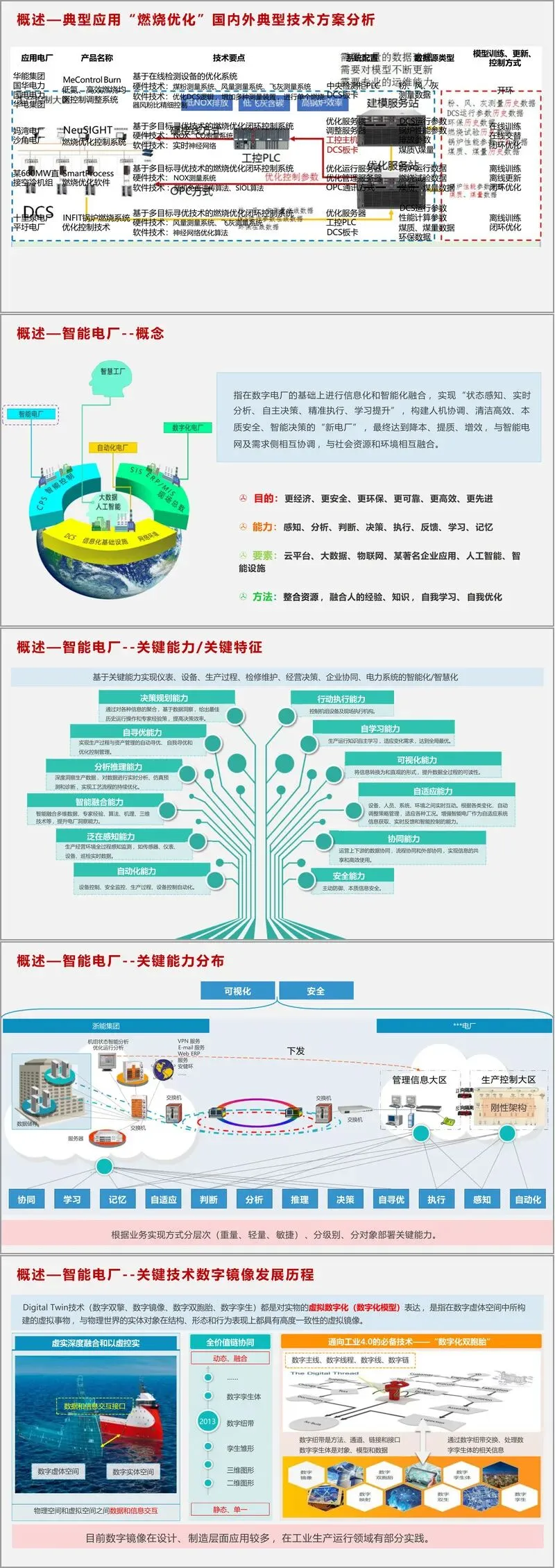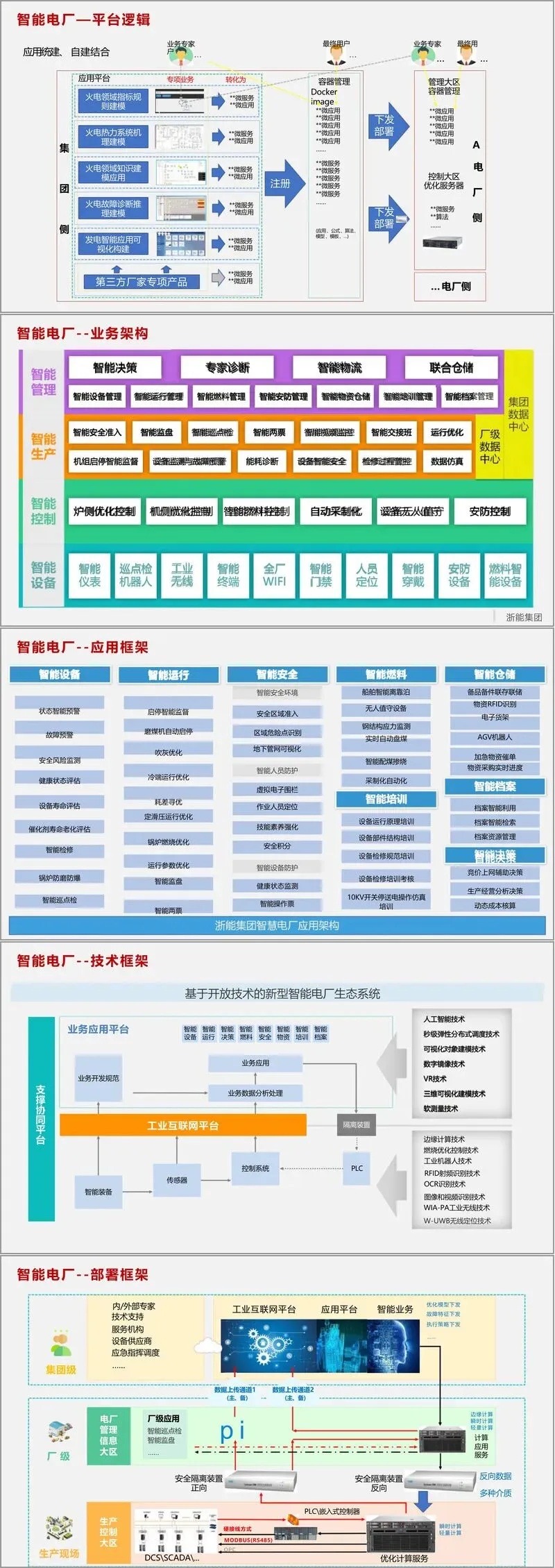 在架构设计上,方案构建了层次分明、协同联动的体系。业务架构涵盖智能设备、运行、安全、燃料、决策等八大模块,技术架构整合了人工智能、数字镜像、边缘计算等关键技术,部署架构区分生产控制大区与管理信息大区,确保数据安全与高效流转。其中,数字镜像技术作为核心支撑,实现了物理设备与虚拟模型的实时联动,为设备监测、故障诊断提供了可视化基础。