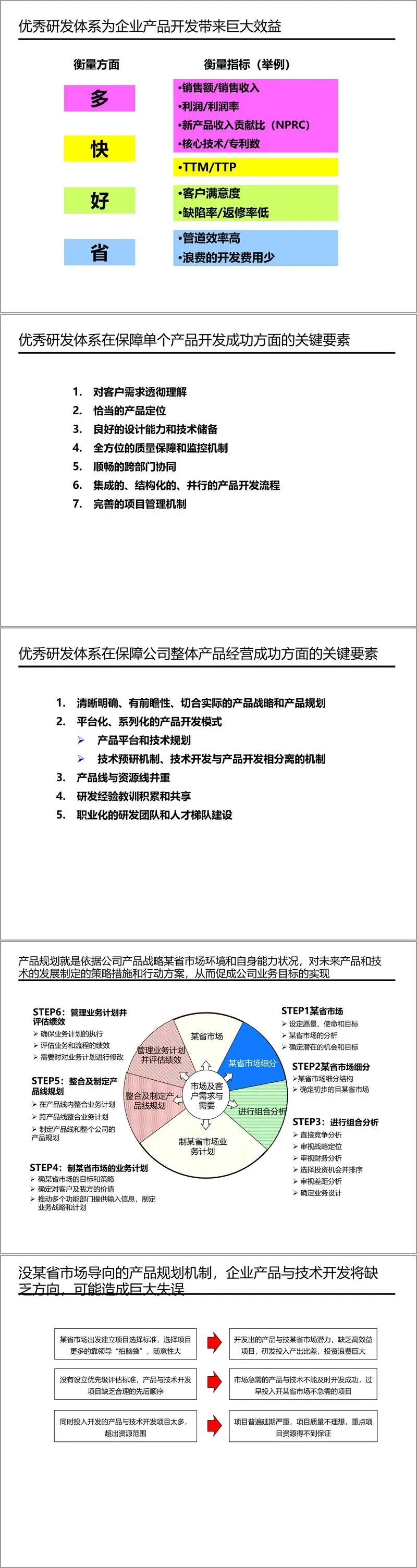 产品规划作为IPD的前端环节,对企业产品开发方向具有决定性影响。文件指出,缺乏市场导向的规划机制容易导致产品开发偏离市场需求,资源投入效率低下。因此,IPD强调通过系统的市场分析、细分、组合分析等步骤,制定清晰的产品线业务计划,确保产品与技术开发符合公司战略,并能有效响应市场变化。