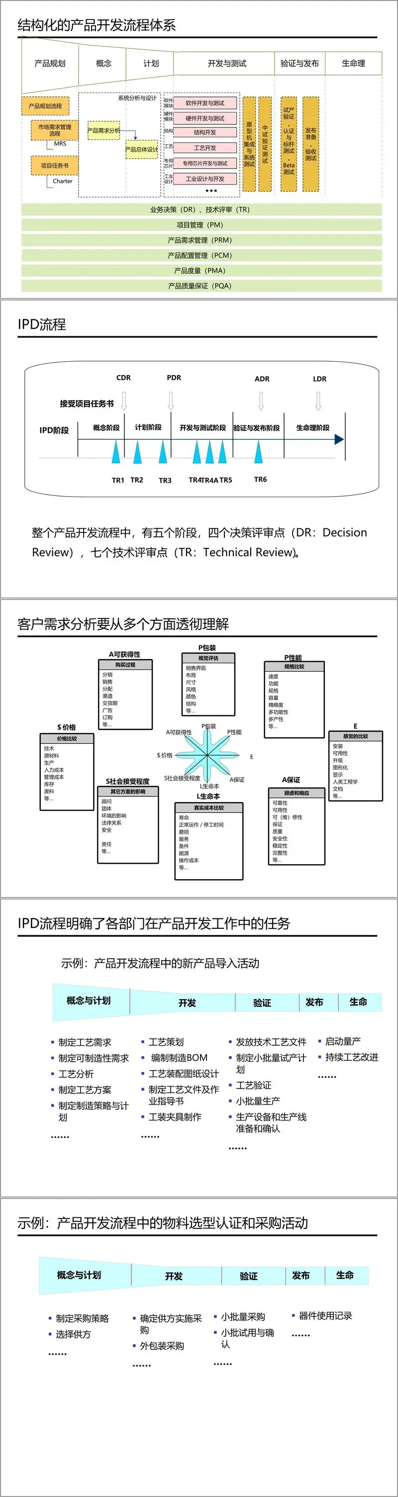 在流程设计上,IPD采用结构化的开发流程,将产品开发划分为六个主要阶段,并设置了四个决策评审点(DR)和七个技术评审点(TR)。这种阶段-关卡模型确保了项目在关键节点能够得到有效评估,及时调整方向,降低开发风险。同时,IPD强调并行的子流程管理,包括项目管理、系统工程、共用构建模块(CBB)重用、文档管理、质量控制等,从而形成一套完整的流程体系。