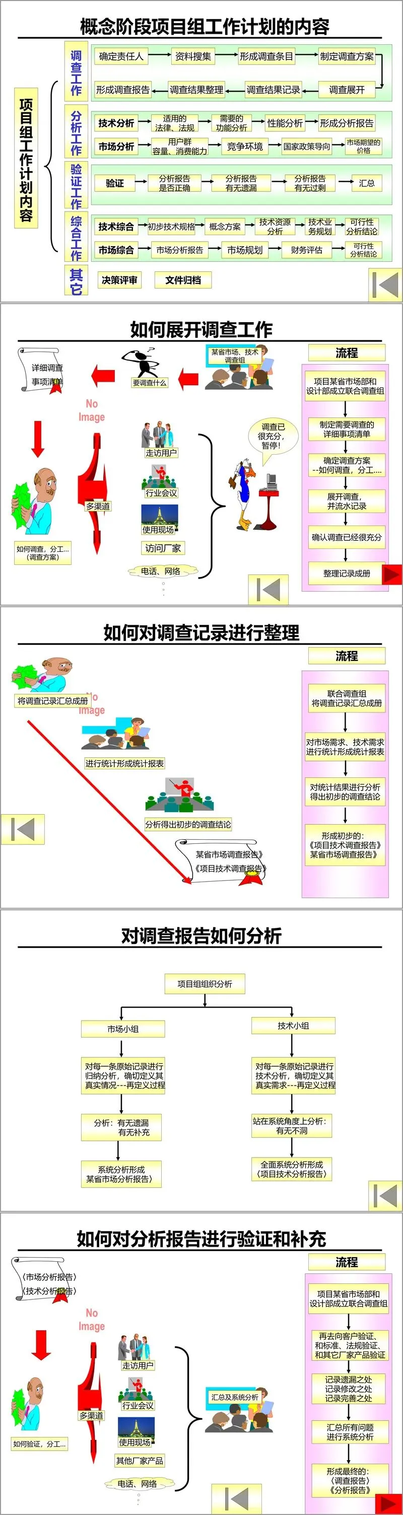 在具体操作层面,文件详细阐述了IPD各阶段的工作流程和操作细则。立项阶段,项目建议需经过多轮评审与决策,最终由研究所下达任务书,并正式组建项目组。概念阶段的核心任务是通过市场调查与技术分析,形成可行性分析报告,包括市场可行性分析报告和技术可行性分析报告。这些报告需综合多方面信息,为后续决策提供依据。