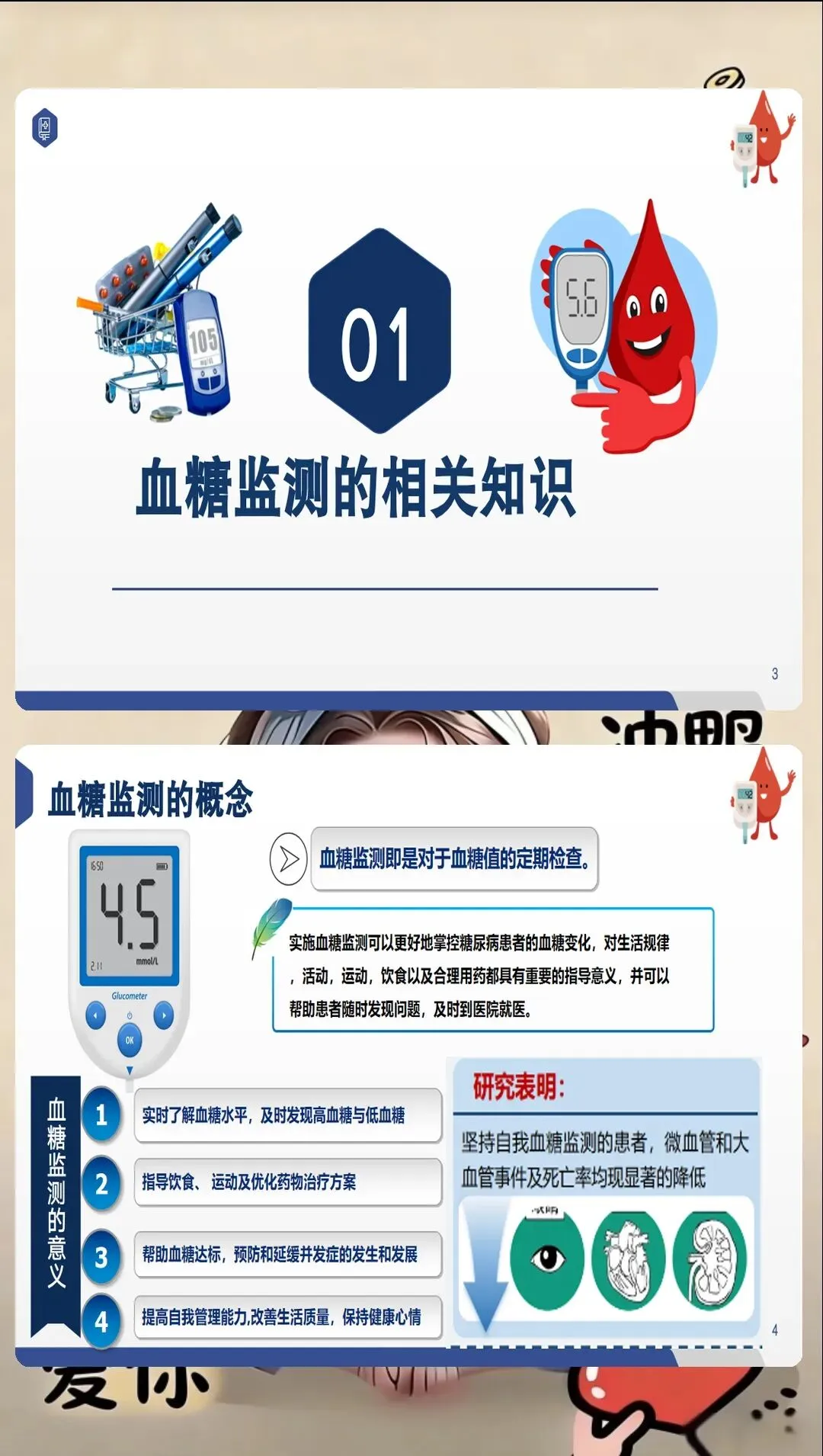 血糖监测在临床实践中具有不可替代的重要作用。对于糖尿病患者,规律监测血糖是评估治疗效果、调整治疗方案的基础。研究表明,规律自我血糖监测可使糖化血红蛋白降低0.3%-0.5%,显著减少并发症发生。对于危重症患者,血糖监测是发现和处理高血糖、低血糖的关键手段,有助于维持血糖在目标范围,改善预后。