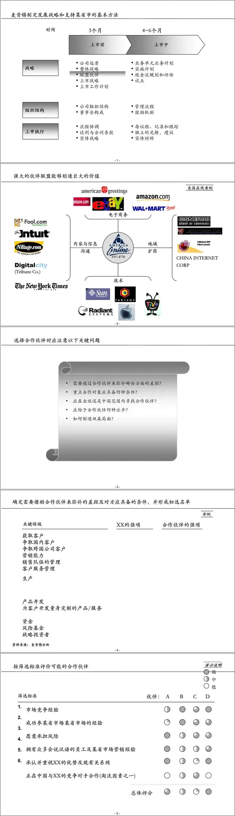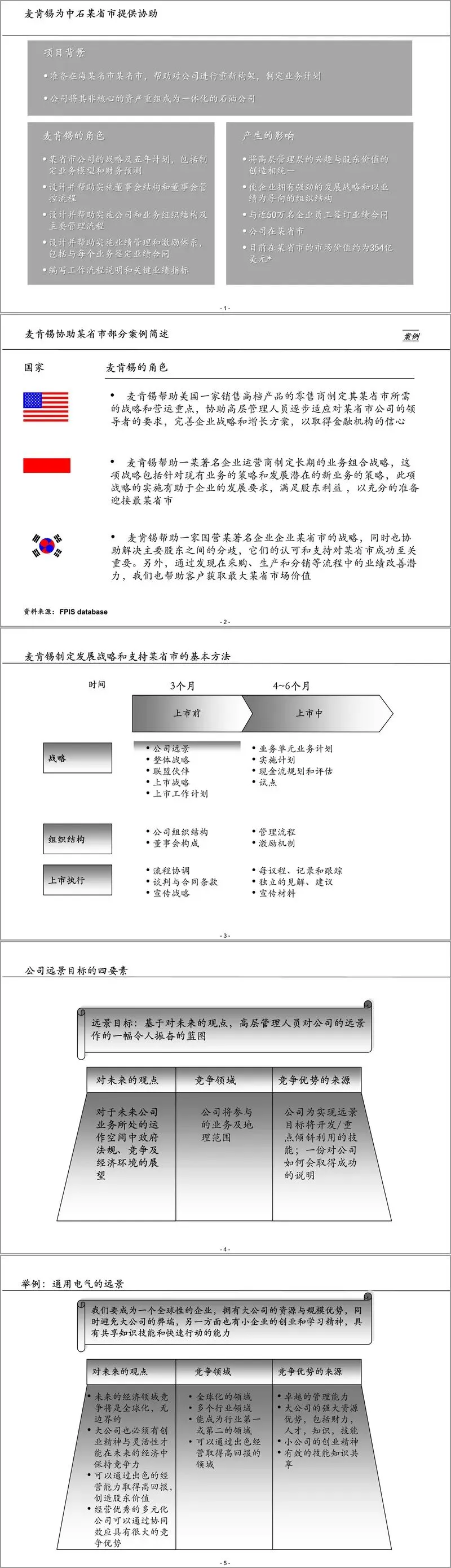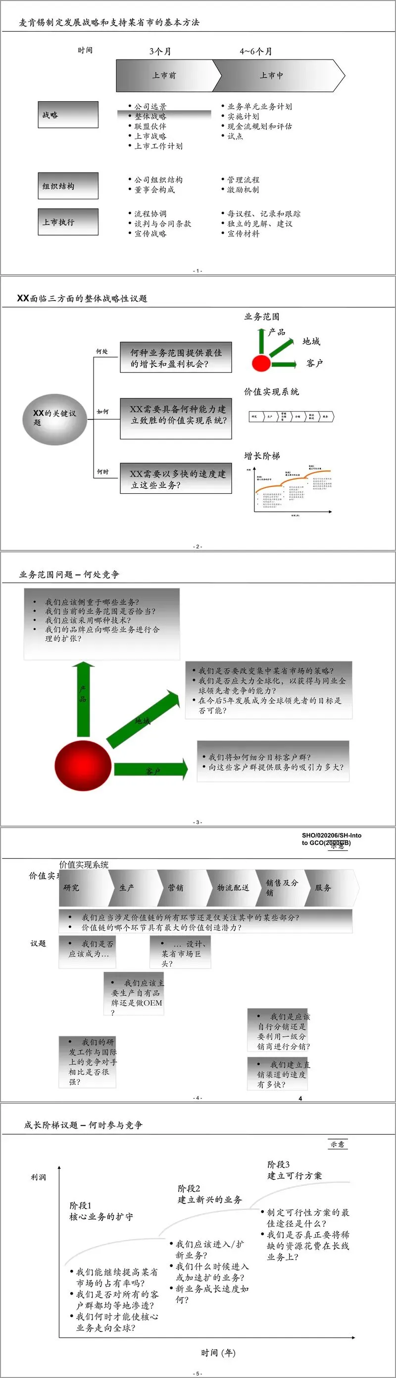 麦肯锡的咨询支持聚焦三大核心领域:战略制定、组织结构优化与上市执行。在战略层面,协助XX 集团明确 “何处竞争、如何竞争、何时竞争” 的核心命题,制定整体战略与业务单元专项战略,同步规划某省市战略及现金流预测与价值评估。组织层面,设计适配业务发展的组织架构、管理流程与岗位描述,建立以关键业绩指标(KPI)为核心的绩效管理系统与匹配的薪酬体制,构建高效的人才吸引与留存机制。上市执行层面,提供全流程支持,包括选择专业顾问、商签服务合同、制定沟通战略,以及流程管理与宣传材料制作等关键环节。