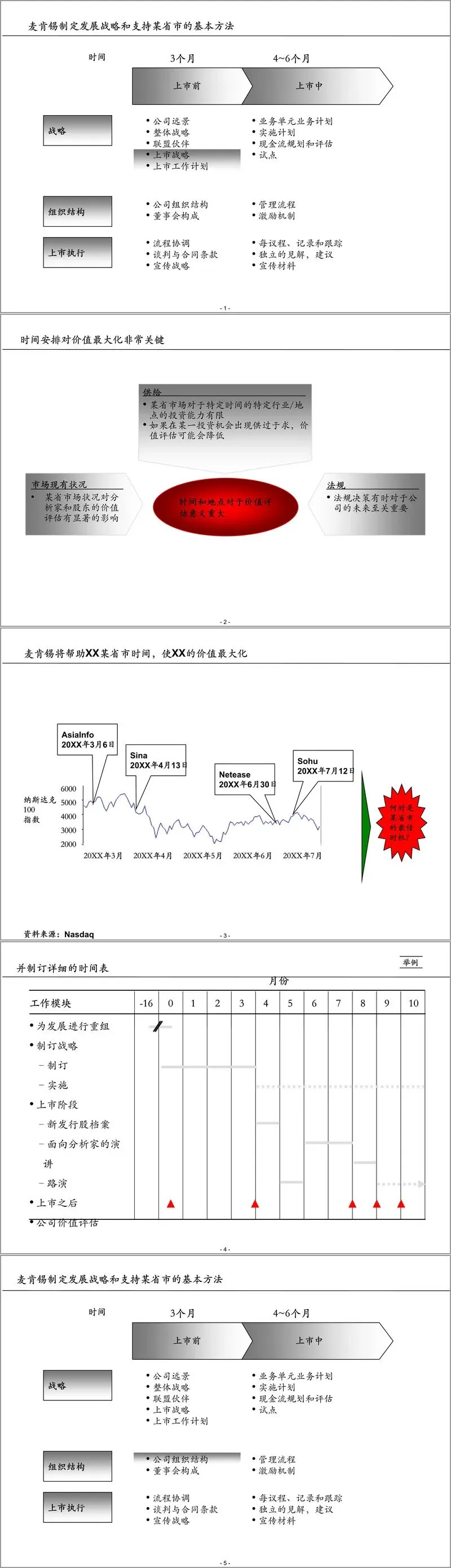 上市筹备过程中,麦肯锡强调多专业机构的协同配合,协助 XX 集团筛选律师事务所、投资银行、审计机构等服务提供商,建立高效的项目管理机制。沟通战略的一致性至关重要,需在发行前、发行中、发行后保持统一口径,针对证监会、现有股东、潜在投资者、员工、客户等不同利益团体的关注点,制定差异化沟通内容,通过招股书、分析师演示报告、路演等形式传递企业价值。