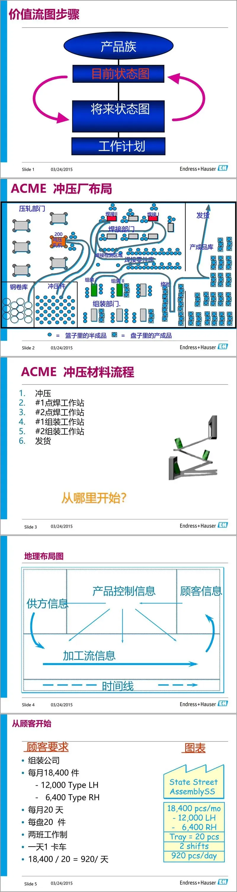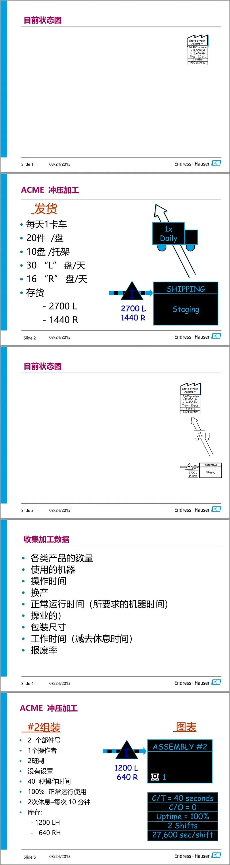 目前状态图的绘制需全面收集顾客要求、加工数据、供方信息及产品控制信息。以 ACME 冲压厂为例,需明确顾客月需求 18400 件(含 12000 件LH 型和 6400 件 RH 型),记录各工序的周期时间、换产时间、正常运行时间及库存情况,同时梳理从供方(密歇根钢铁公司)到顾客(州街组装公司)的材料流与信息流,最终计算出增值时间与生产提前期,识别出流程中的浪费与瓶颈。