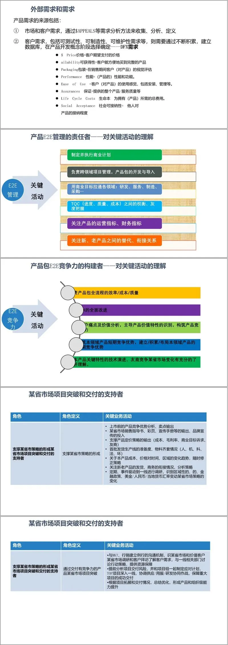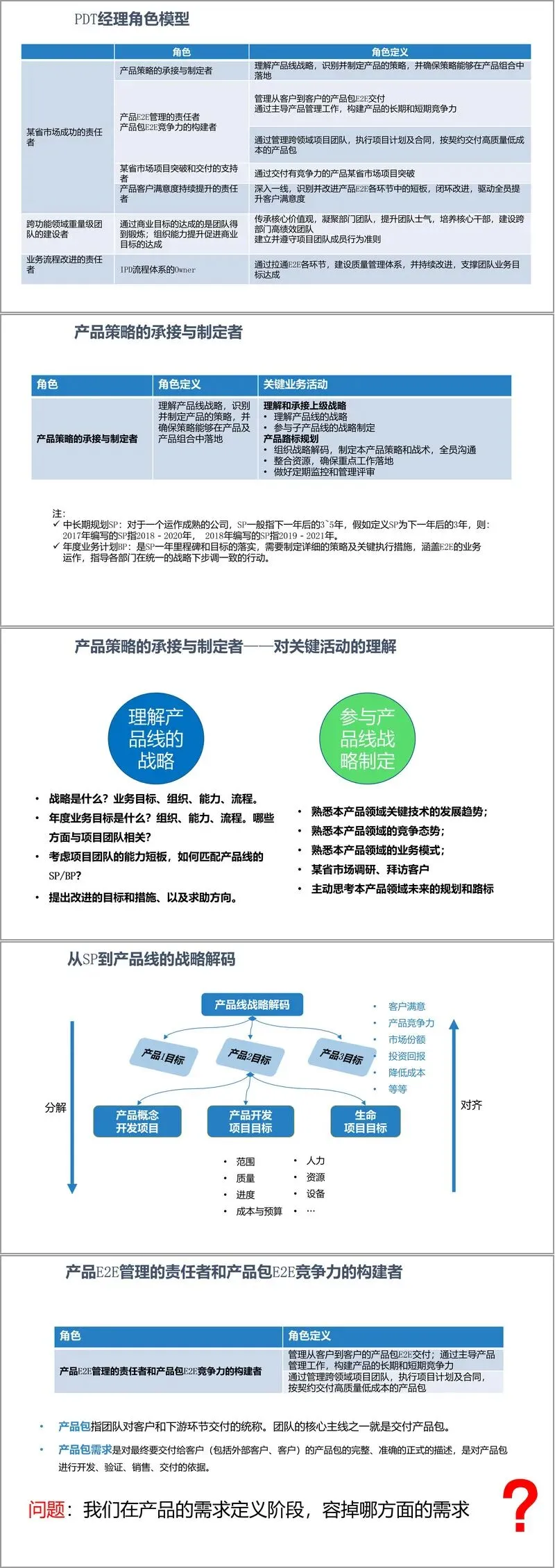 作为市场成功的责任者,PDT 经理需精准承接产品线战略,制定产品策略与路标规划,通过 $APPEALS 等方法深度挖掘客户需求,构建产品端到端竞争力。从战略解码来看,PDT经理需将中长期战略(SP)与年度业务计划(BP)分解为具体产品目标,确保产品开发与公司战略同频。在产品全生命周期中,不仅要保障开发交付的质量、成本与进度,更要持续优化产品经营表现,提升客户满意度,实现销量、收入与利润目标的达成。
