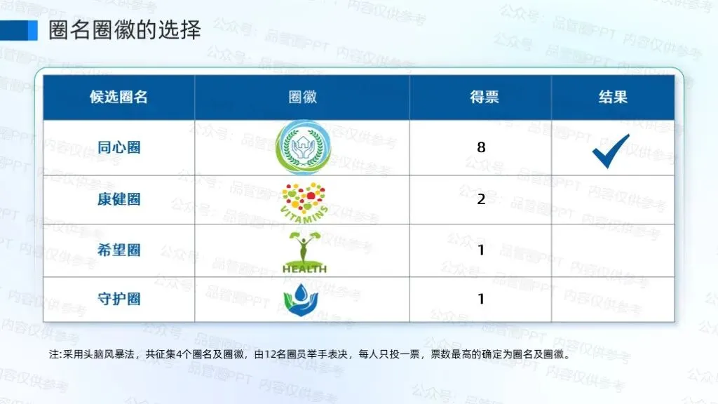 成立12人品管圈,聚焦院社协同模式,系统构建居家伤口造口患者全周期延续性护理指导体系,推动优质护理资源向社区延伸。采用头脑风暴法,共征集4个圈名及圈徽,由12名圈员举手表决,每人只投一票,票数最高的确定为圈名及圈徽。