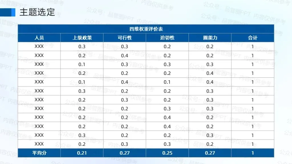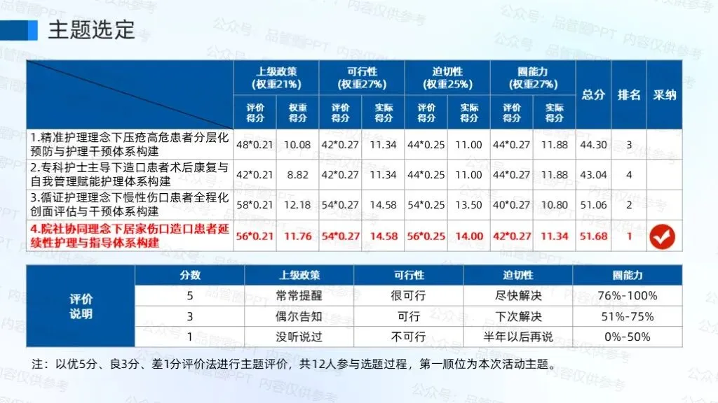 全体圈员通过头脑风暴提出四个备选主题,经过权重评价法选出本次活动主题。