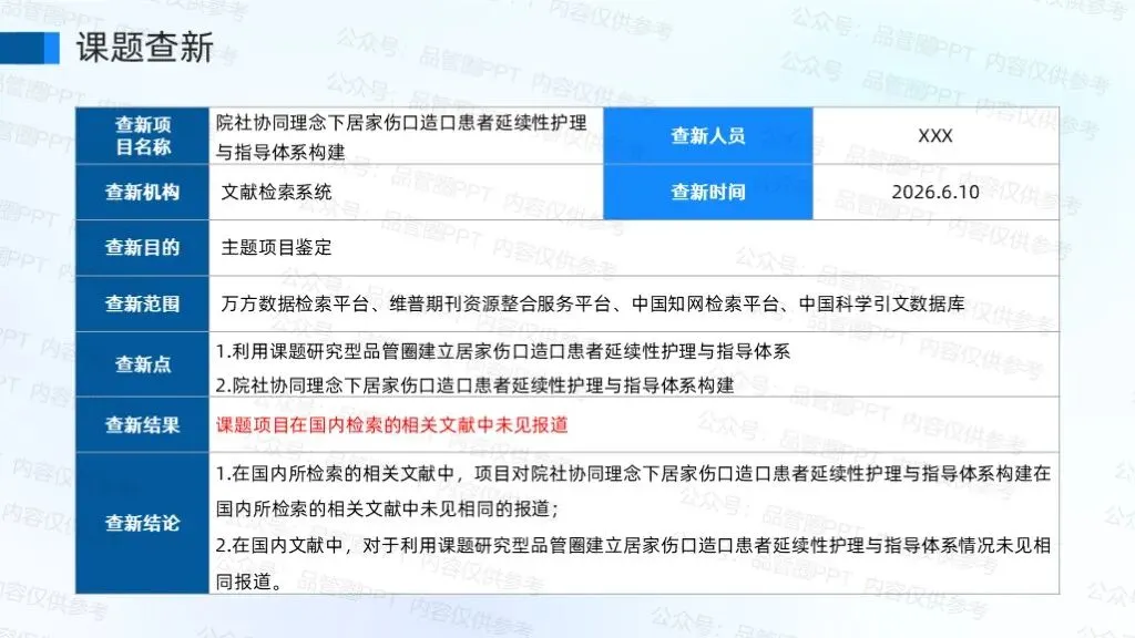 延续性护理指患者在医疗机构间转移或照护等级转换时,提供连续、协调、整体的护理服务,以维护患者健康或满足其多层次健康需求。经过QC-Story判定为课题研究型品管圈,明确项目实施工具。