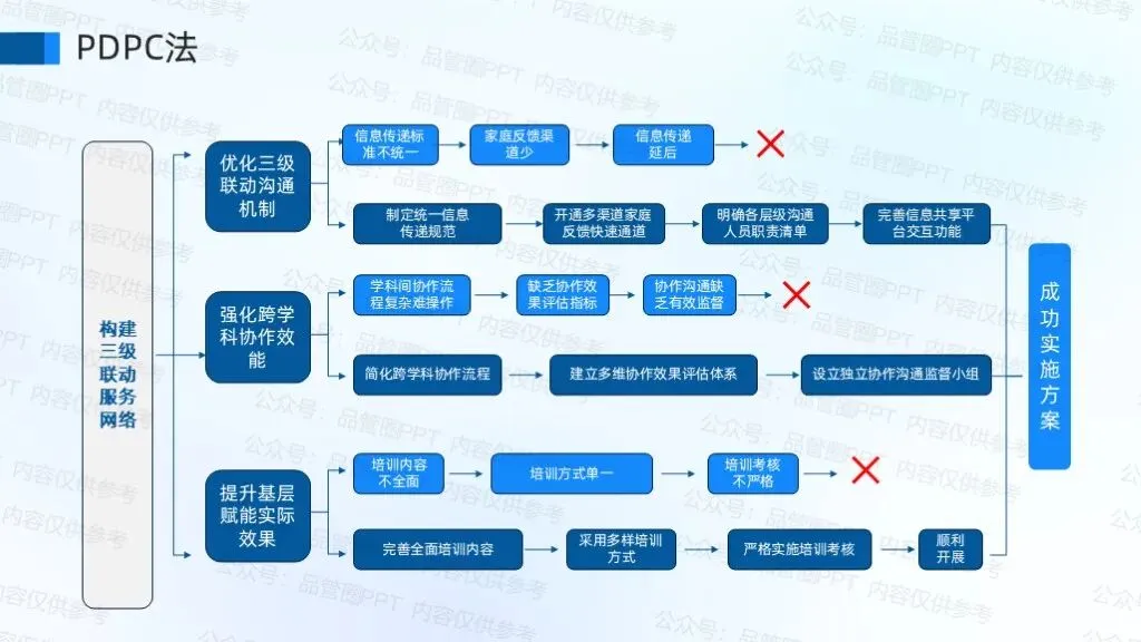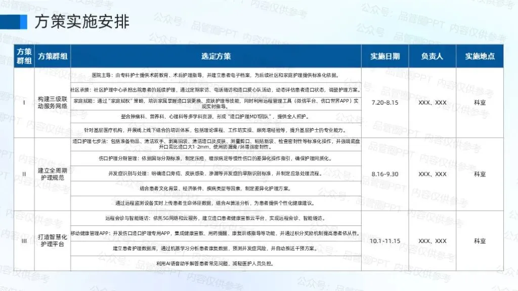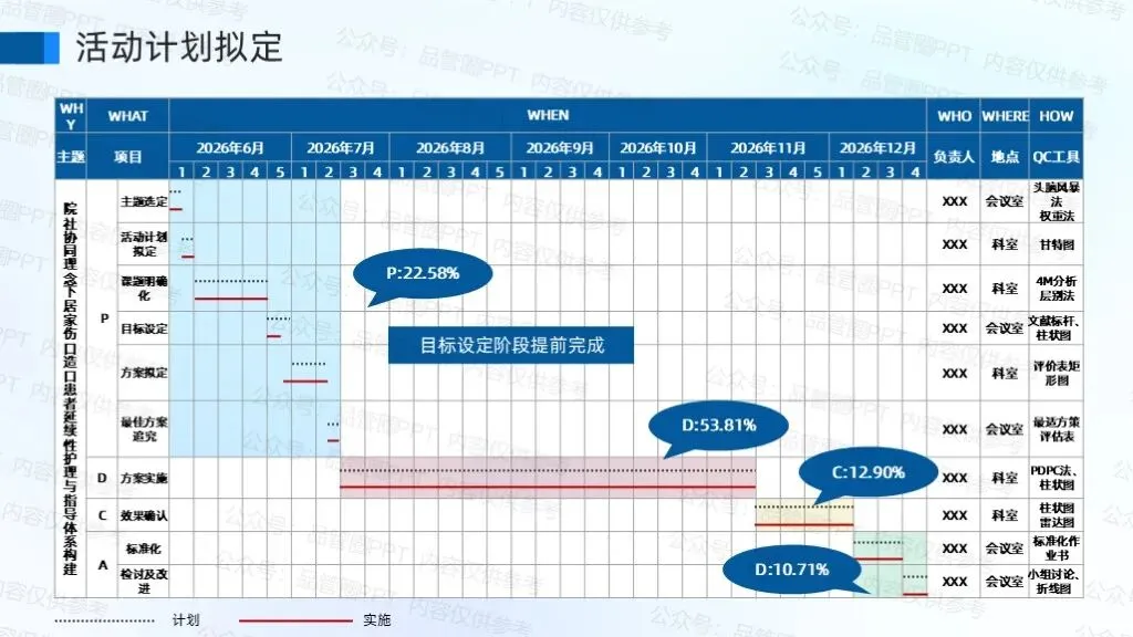 运用PDPC法系统预判院社协同护理中的潜在风险节点,通过动态推演制定应急预案与流程优化方案,有效降低居家伤口造口患者并发症发生率及跨机构协作中断风险。依据甘特图时间规划,确定各项方策实施时间、负责人以及实施地点,保证方策顺利实施。