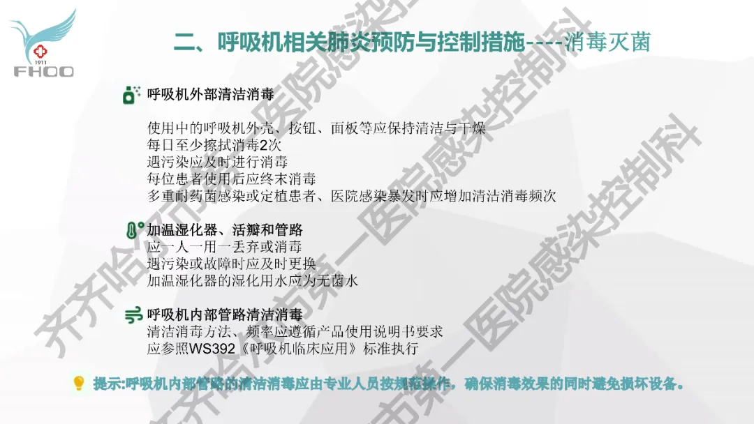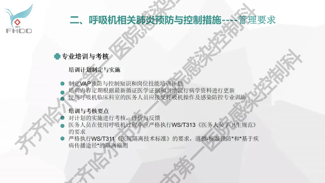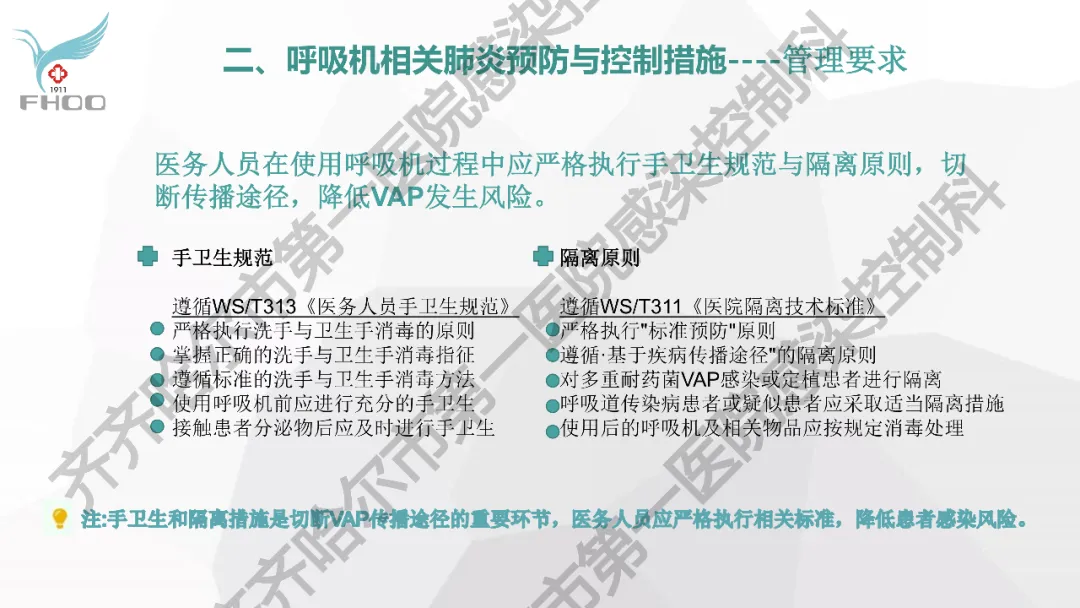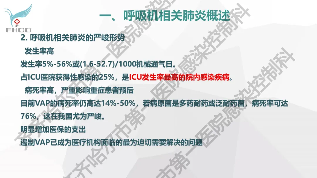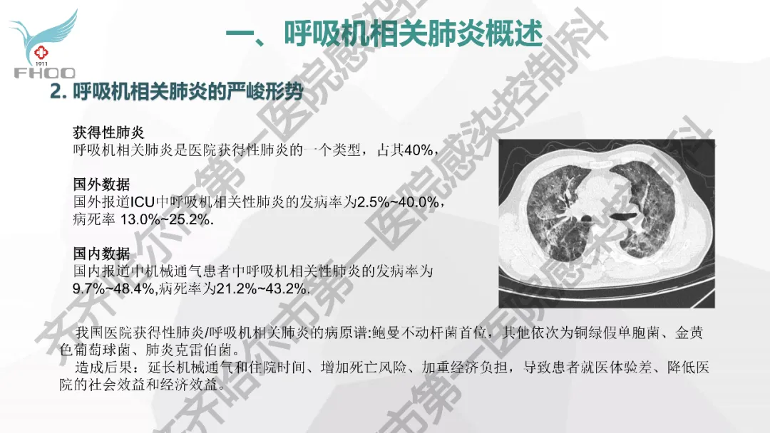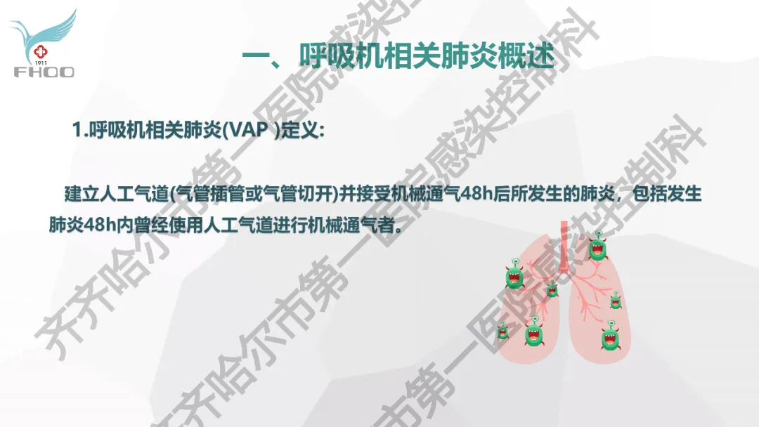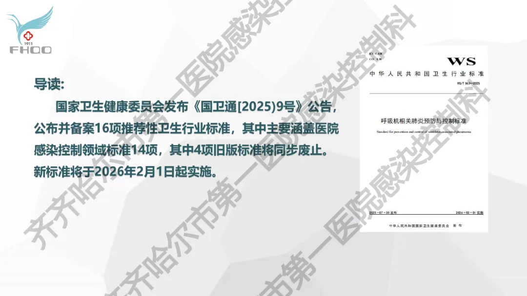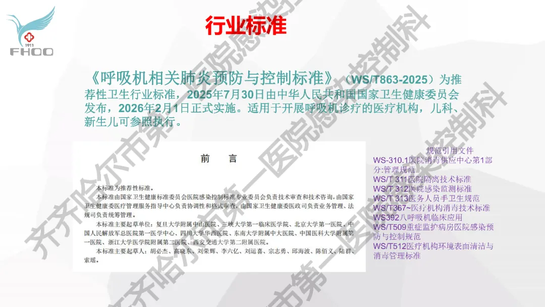 机械通气是抢救危重患者的重要手段,是危重患者的“生命支撑”,但它也可能带来一个“隐形杀手”——呼吸机相关肺炎(VAP)。VAP是机械通气患者最常见的严重医院感染,不仅会加重患者病情、延长住院时间,还会增加治疗成本,甚至威胁患者生命安全,为严格落实国家强制性行业标准要求,进一步强化全院感控意识,规范呼吸机相关肺炎(VAP)预防与控制临床操作流程,切实保障患者医疗安全,提升医疗质量,今日分享由市院感质控中心、我院感控科李颖丽的培训课件《呼吸机相关肺炎预防与控制标准》把“标准条款”转化为“实操指南”,助力一线医护筑牢感控防线!