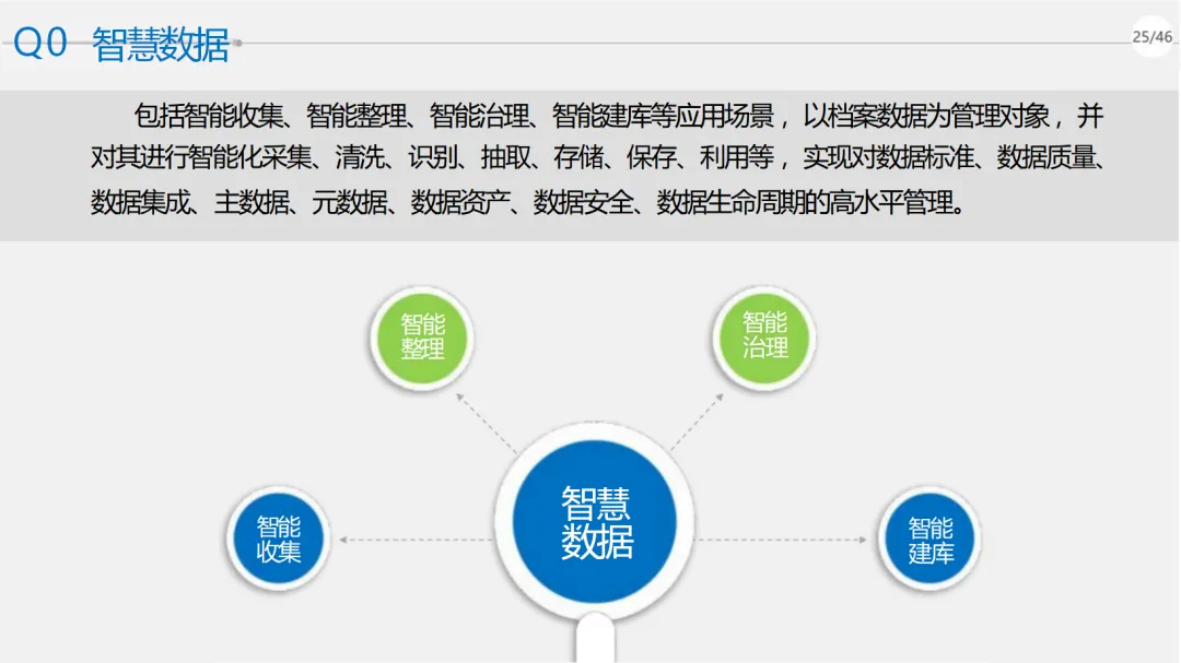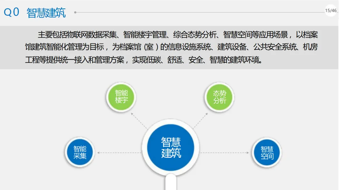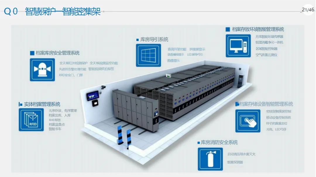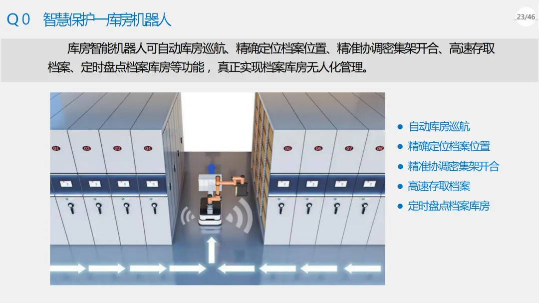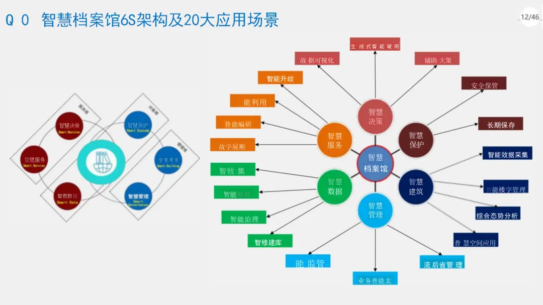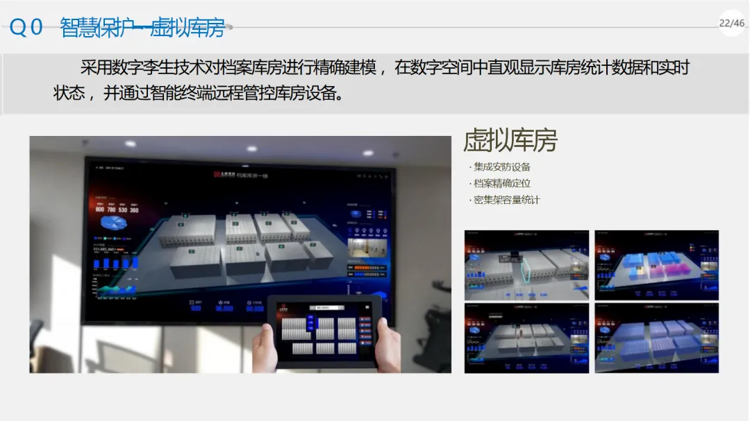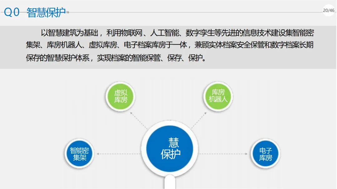 本方案针对档案信息化从数字化向智慧化跃迁的发展趋势,提出以“全面透彻的感知、互动协同的互联、智能融合的应用、以人为本的可持续创新”为核心特征的智慧档案馆整体解决方案。在继承数字档案馆建设成果的基础上,方案融合人工智能、大数据、物联网、云计算等新一代信息技术,构建“三网四库十大应用”业务架构,实现档案资源从被动查询到主动推送、从独立运行到广泛协作、从文书档案到多源信息资源的全面升级。核心架构层面,方案采用6S架构(智慧建筑、智慧保护、智慧数据、智慧服务、智慧决策、智慧管理),覆盖20余个应用场景。智慧建筑通过物联网网关统一接入环境、监控、门禁、照明、暖通等设备,结合数字孪生技术实现档案馆超精细三维建模与综合态势分析;智慧保护构建集智能密集架、库房机器人、虚拟库房、电子档案库房于一体的防护体系,RFID技术实现档案无序存放与有序管理,库房机器人可自动巡航、精准定位、高速存取,真正实现库房无人化;智慧数据聚焦档案数据的智能收集、整理、治理与建库,支持政务服务电子文件“一事一卷”归档、档案自动摘要、关键词提取及知识库构建,推动档案从信息向知识转化;智慧服务集成语音/声纹识别、多模态检索、自然语言处理等技术,实现智能检索、辅助接待、自动编研与数字展陈;智慧决策通过数据可视化与领导驾驶舱,辅助管理者全面掌握运行状况;智慧管理构建统一运维与低代码开发平台,支撑应用柔性化构建。技术亮点层面,方案采用LLM+RAG模式构建档案行业垂直大模型,实现智能问答、自动写稿等生成式应用;基于少样本孪生网络学习实现智能开放审核;通过轻量级语言模型支持档案自动编研;磁光电胶混合存储方案保障电子档案长期安全。最终,智慧档案馆不仅是智慧城市的信息保存中心,更是数据开发与知识服务的核心枢纽,推动档案事业从“管文件”向“管数据、赋智能、创价值”的深刻变革。