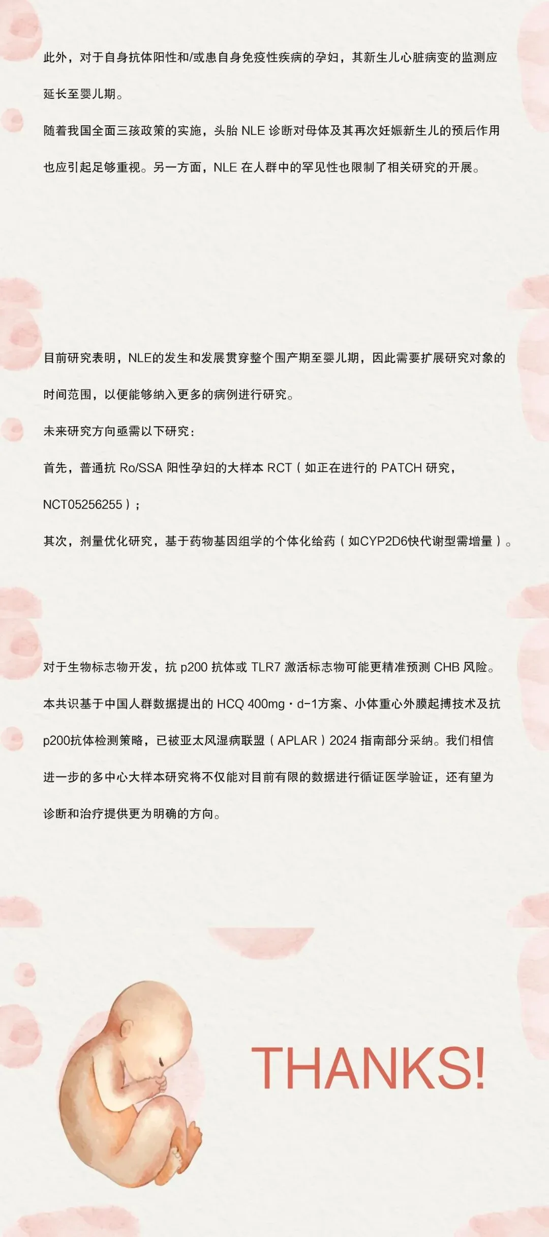 - 系统梳理NLE的诊断和鉴别诊断、NLE的产前预防和治疗、NLE的产后管理、NLE的预后和随访等;