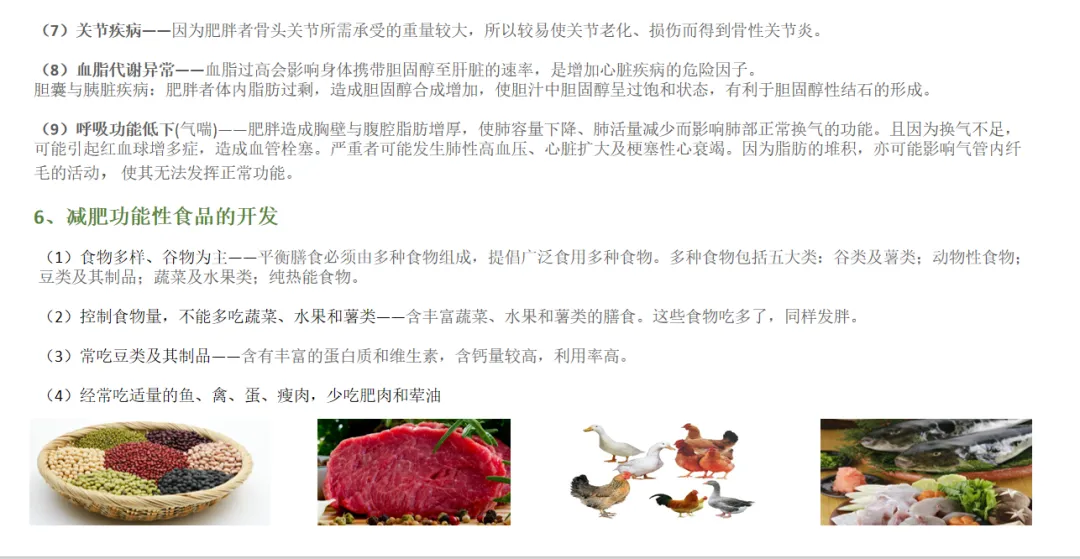 (5)肥胖不仅影响形体美,而且给生活带来不便。此外还有关节软组织损伤、生殖能力下降以及心理障碍、心脏病、糖尿病、动脉粥样硬化、脂肪肝、胆结石、水肿、痛风等。