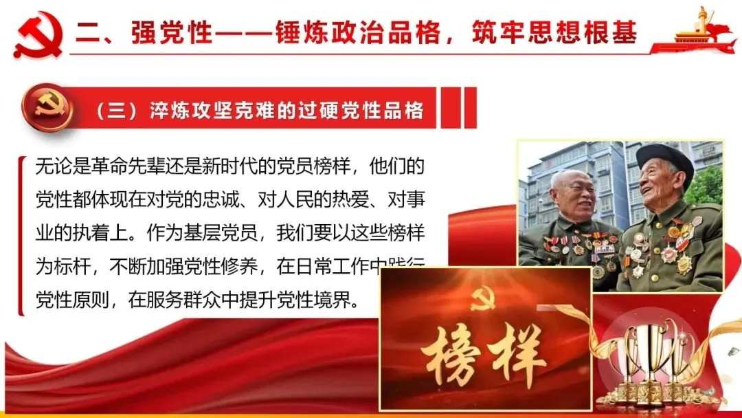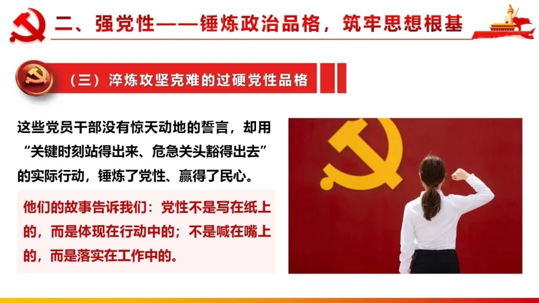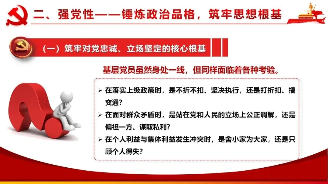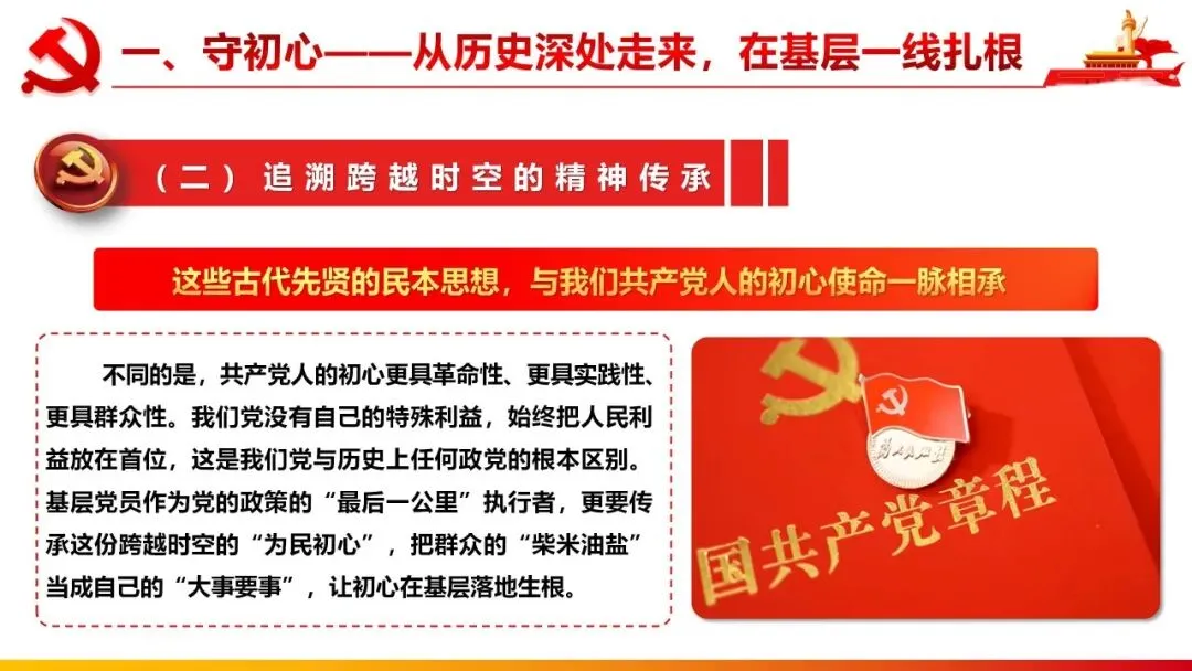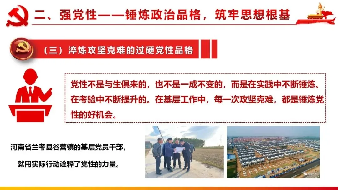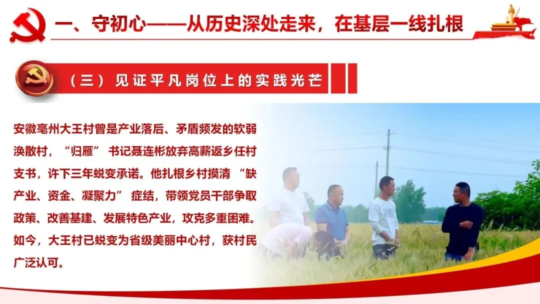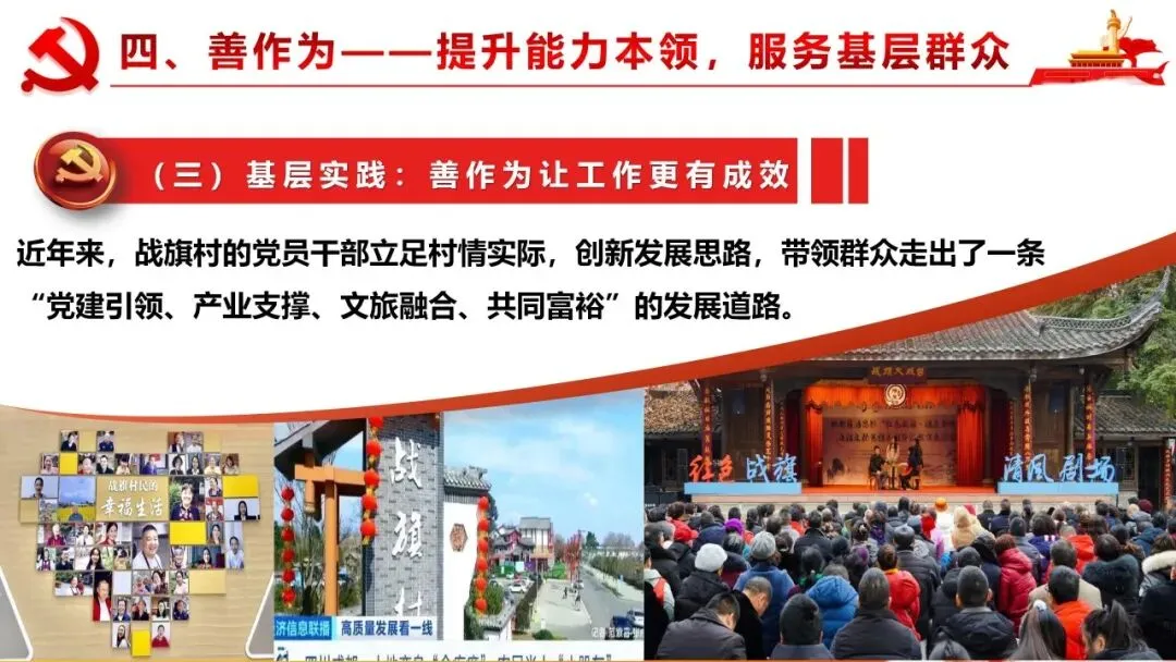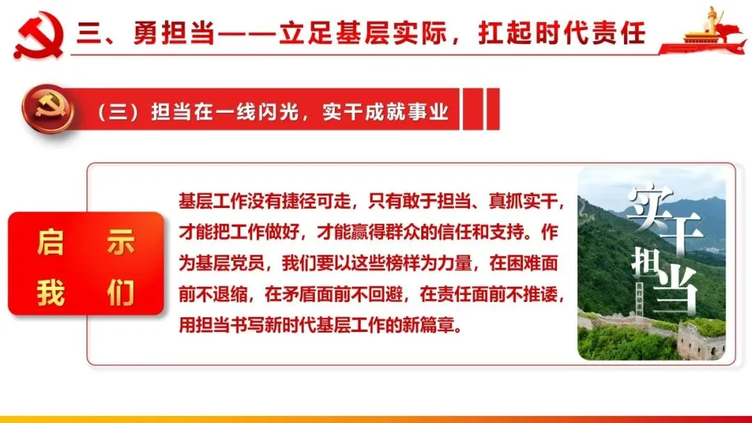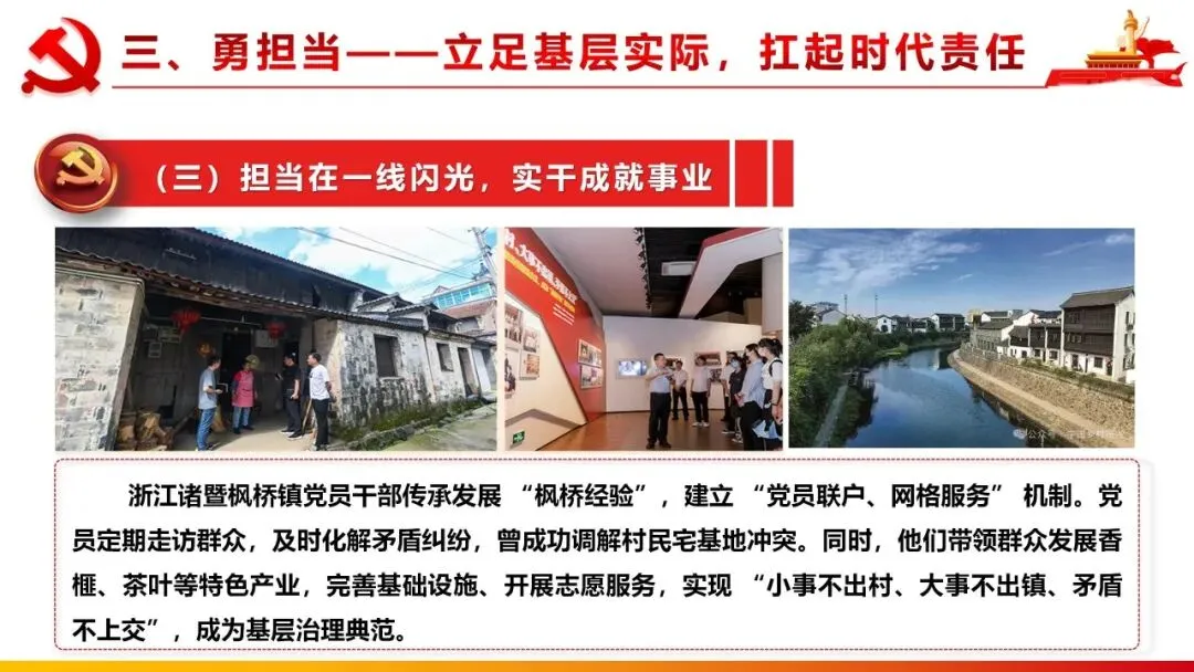 党的根基在基层,服务群众无小事!新时代基层党员干部,要以初心为魂,把群众“柴米油盐”当大事;以党性为骨,在考验中坚守忠诚本色;以担当为责,直面矛盾不退缩;以作为为要,练就善作善成的硬本领。从枫桥镇的矛盾调解,到战旗村的产业振兴,实干才是硬道理。扎根一线、真抓实干,才能成为让组织放心、群众满意的合格党员。
