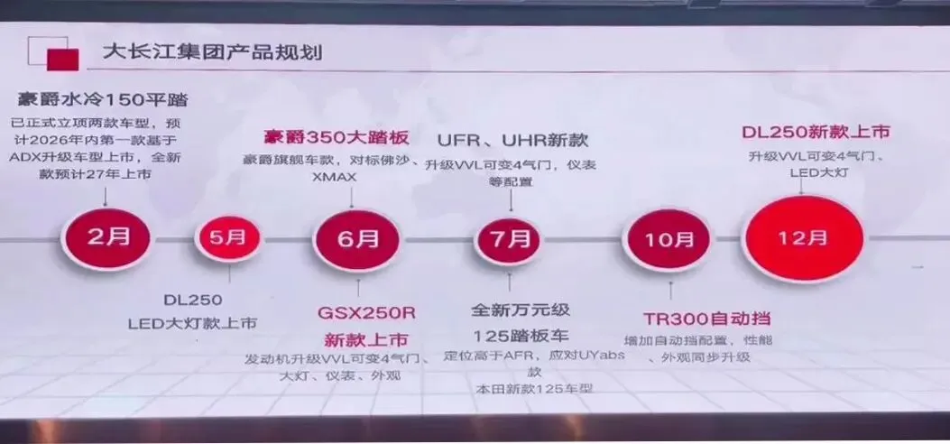 近日,一张大长江集团旗下豪爵2026产品计划的 ppt 截图在各大车友群和抖音视频中被疯传。从这张关键页 ppt 的内容中可以看到从今年 2 月到 12 月的 将近 10 大产品上市计划!