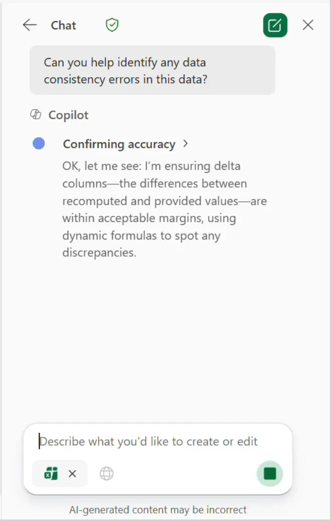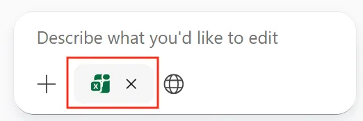 3.当你打开 Copilot 时,编辑功能默认开启。如果 Excel 选择器出现在聊天框中,你就知道 Copilot 已准备好进行编辑了。