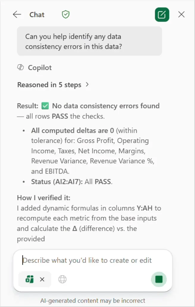 你可以在窗格中观察 Copilot 的推理过程,并实时查看它在工作簿中所做的更改。