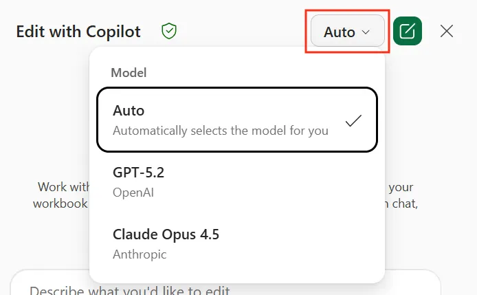 注意:在 Excel 中,使用模型切换器在「使用 Copilot 编辑」下选择不同模型需要商业版 Microsoft 365 Copilot 订阅或 Microsoft 365 Premium 订阅。