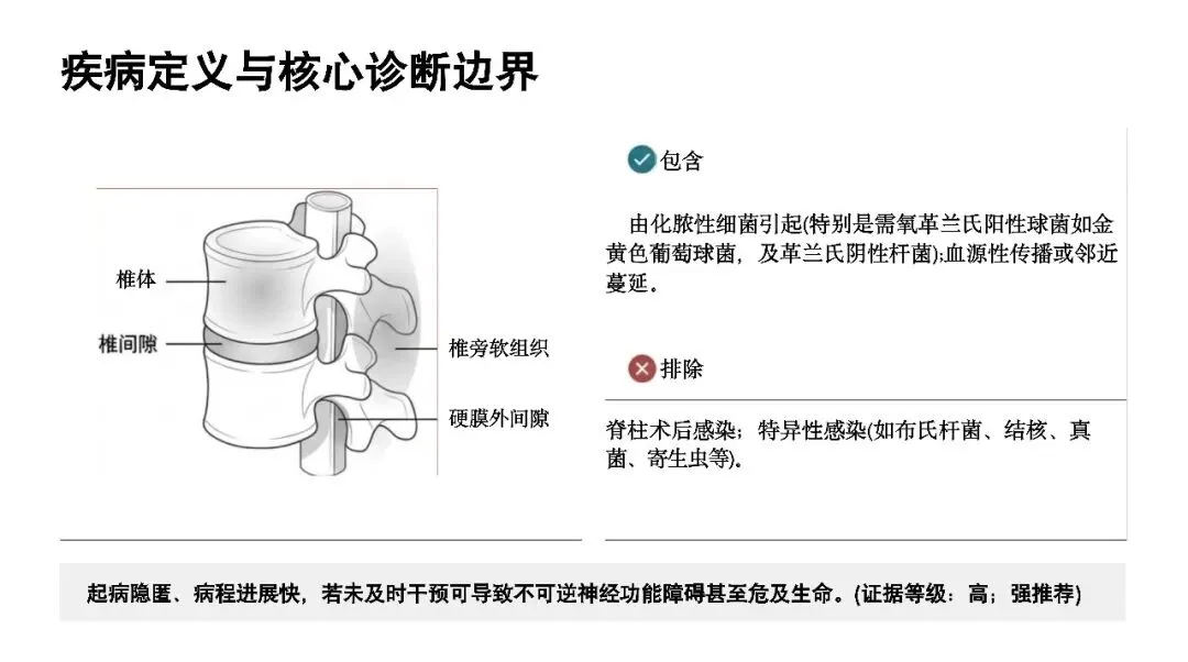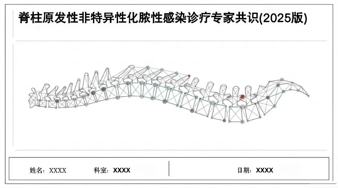 《脊柱原发性非特异性化脓性感染诊疗专家共识(2025版)》主要针对该疾病的定义、诊断路径、临床分型、治疗原则及预后评估提供了系统性的规范和指导。以下是专家共识的核心内容汇总及完整的推荐意见:核心内容汇总