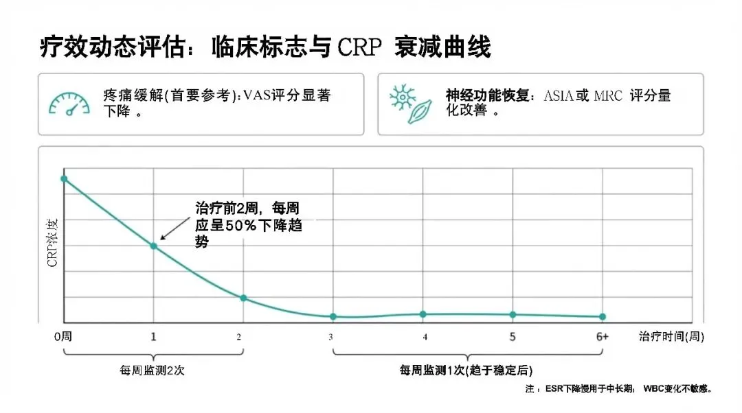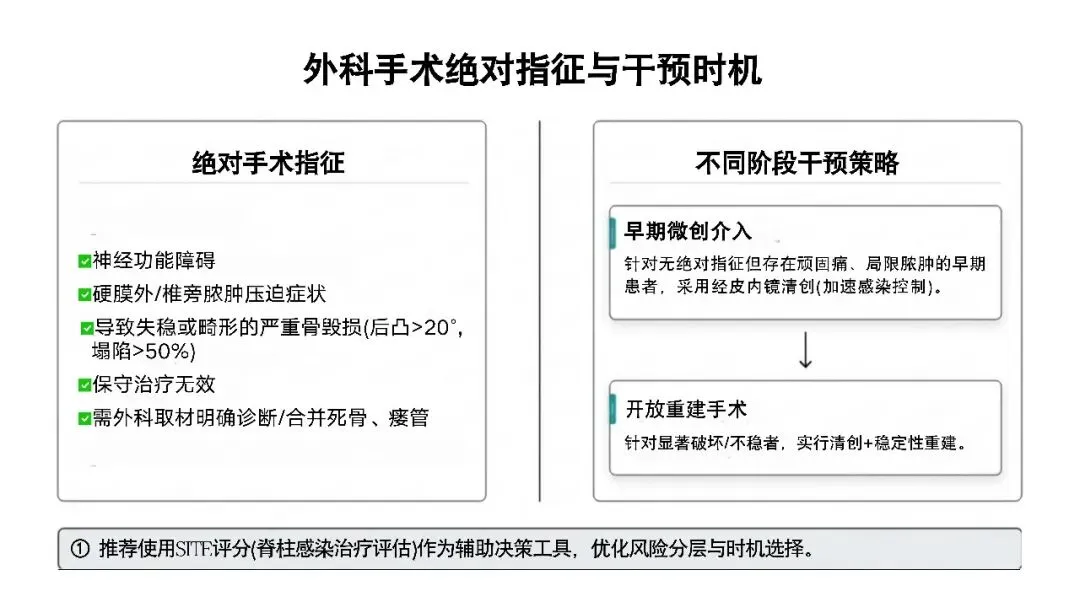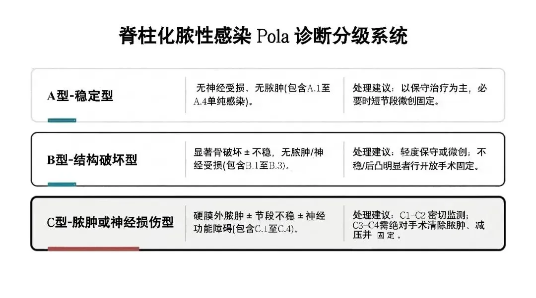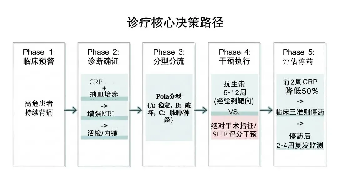 疾病定义与特点:脊柱原发性非特异性化脓性感染是由化脓性细菌(如金黄色葡萄球菌)引起的椎体、椎间隙、椎旁组织或硬膜外间隙的感染。该病起病隐匿且进展快,早期极易误诊漏诊,可能导致严重的神经功能障碍和脊柱不稳。诊断评估路径:共识建议遵循“高度怀疑+多模态评估+病原学确证”的路径 。诊断依赖于临床表现、实验室检查(如敏感的CRP指标及血培养)、影像学(首选增强MRI)以及病原学检测(穿刺或手术取材)的综合判断 。临床分型:推荐采用Pola分型系统,结合骨破坏、节段不稳、脓肿形成、神经受损等指标,将感染分为三大类:A型(稳定型)、B型(结构破坏型)和C型(脓肿或神经损伤型) 。治疗与预后:治疗强调多学科协作(MDT),总目标为控制感染、重建稳定性并防止复发 。抗菌治疗总疗程通常为6~12周 。手术干预适用于出现神经症状、严重脓肿压迫或脊柱失稳等情况 。疗效评估首要看临床症状(尤其是疼痛缓解)和炎症指标(CRP)的改善 。